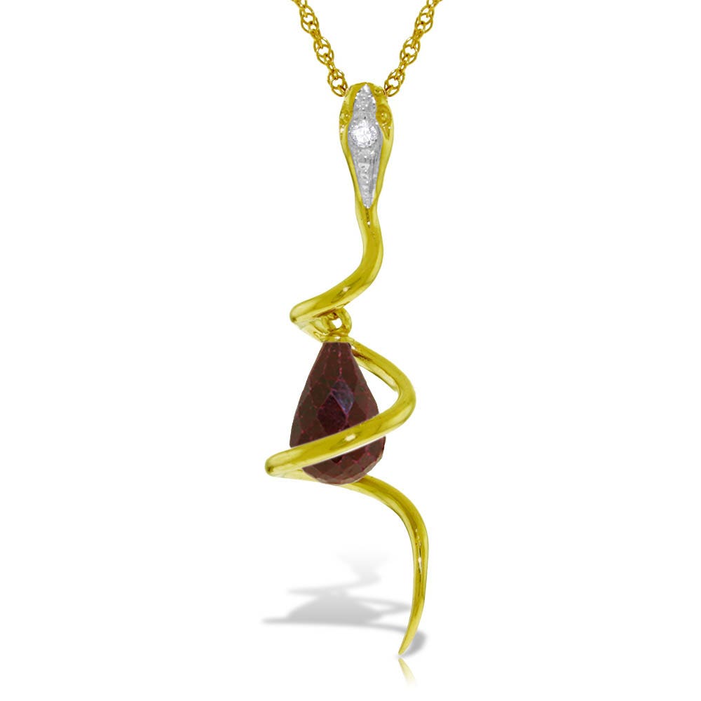 Ruby & Diamond Pendant Necklace handcrafted in solid gold. Single 3.3 ct genuine ruby, single 0.03 ct diamond. Briolette cut. The pendant is suspended from a gold double link rope chain with spring clasp. Size: 10.2 x 36.8 mm (0.4 x 1.45 in). Material: 9ct Gold. Total metal weight: 2.54 gr. 1 briolette cut ruby (9 x 6 mm, VS1 clarity) = 3.3 ct. 1 round brilliant cut diamond (G colour, SI2 clarity) = 0.03 ct. Colour: Red. Stone cut: Briolette Cut. Anniversary: 15th Anniversary, 40th Anniversary. Birthstone: July.