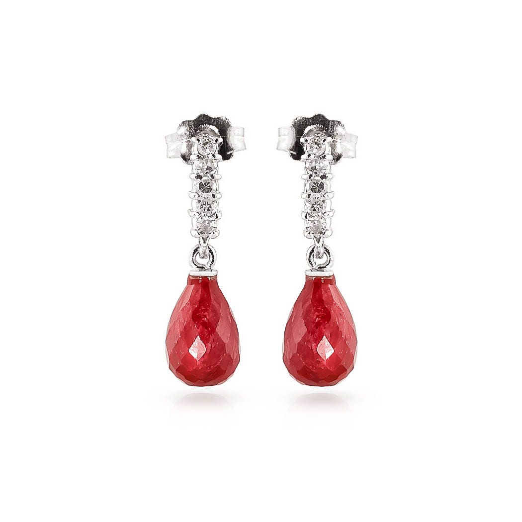 Ruby & Diamond Chandelier Earrings handcrafted in solid white gold. Two genuine rubies, total 6.6 ct, ten diamonds, total 0.15 ct for both earrings combined. Briolette cut. Size: 5.1 x 21.6 mm (0.2 x 0.85 in). Material: 9ct White Gold. Total metal weight: 2.0 gr. 2 briolette cut rubies (9 x 6 mm, VS1 clarity) = 6.6 ct total for pair. 10 round cut diamonds (K colour, SI2 clarity) = 0.15 ct total for pair. Colour: Red. Stone cut: Briolette Cut. Anniversary: 15th Anniversary, 40th Anniversary. Birthstone: July.