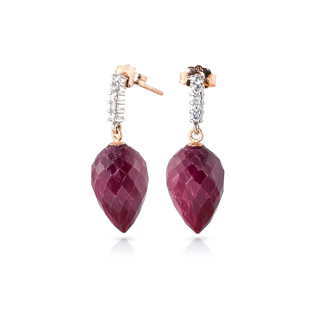 Ruby & Diamond Stud Earrings handcrafted in rose gold plated 9ct gold. Two genuine rubies, total 26.1 ct, ten diamonds, total 0.15 ct for both earrings combined. Pointed briolette cut. Post with friction back to fasten. Size: 10.2 x 27.2 mm (0.4 x 1.07 in). Material: 9ct Rose Gold. Total metal weight: 5.4 gr. 2 pointed briolette cut rubies (15 x 10 mm, VS1 clarity) = 26.1 ct total for pair. 10 round cut diamonds (K colour, I3 clarity) = 0.15 ct total for pair. Colour: Red. Stone cut: Pointed Briolette Cut. Anniversary: 15th Anniversary, 40th Anniversary. Birthstone: July.