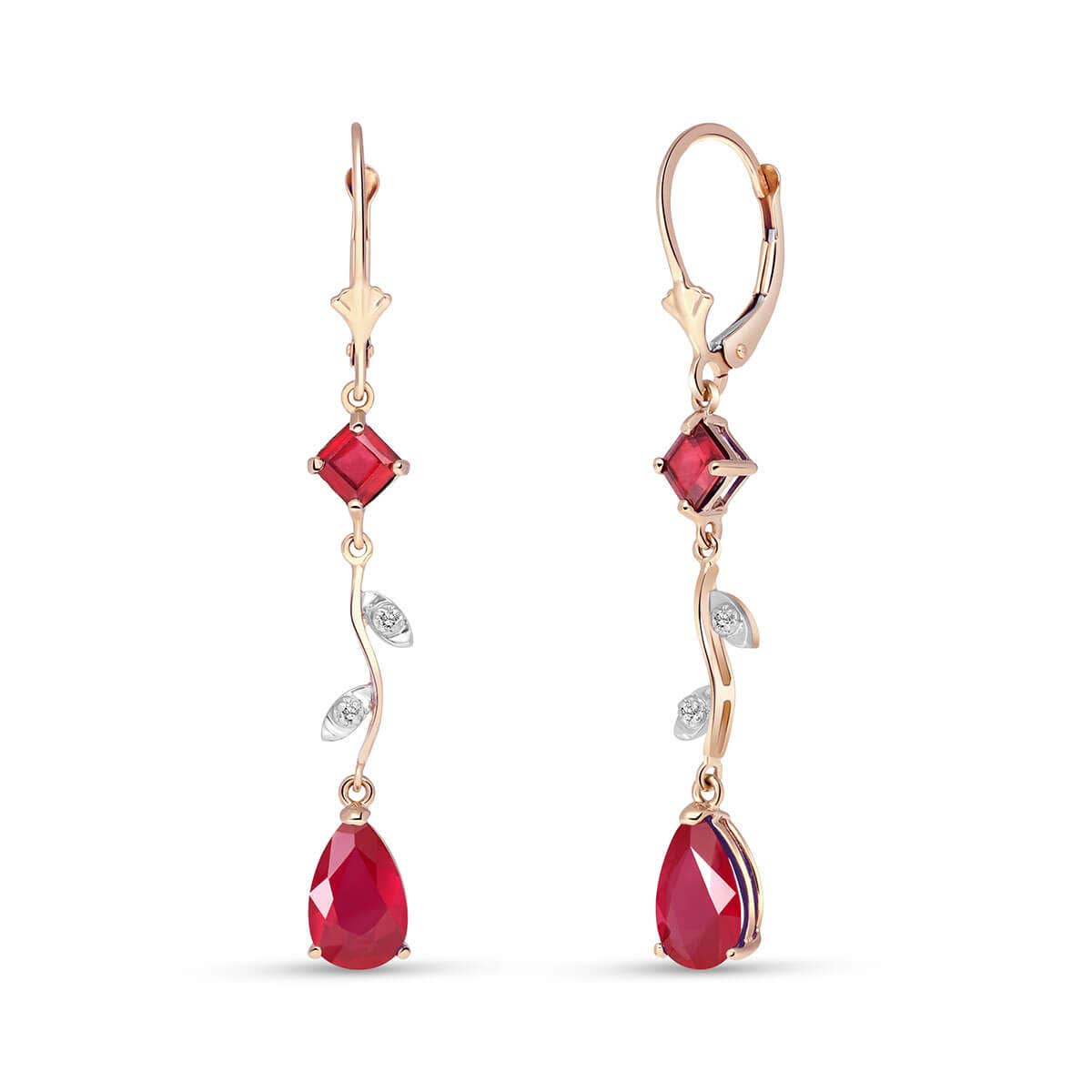Ruby & Diamond Chandelierdrop Earrings handcrafted in rose gold plated 9ct gold. Four gemstones, total 3.95 ct, four diamonds, total 0.02 ct for both earrings combined. Square cut. Size: 6.1 x 48.3 mm (0.24 x 1.9 in). Material: 9ct Rose Gold. Total metal weight: 2.6 gr. 2 square cut rubies (4 x 4 mm, VS1 clarity) = 0.95 ct total for pair. 2 pear cut rubies (9 x 6 mm, VS1 clarity) = 3 ct total for pair. 4 round cut diamonds (K colour, SI1 clarity) = 0.02 ct total for pair. Colour: Red. Stone cut: Square Cut. Anniversary: 15th Anniversary, 40th Anniversary. Birthstone: July.