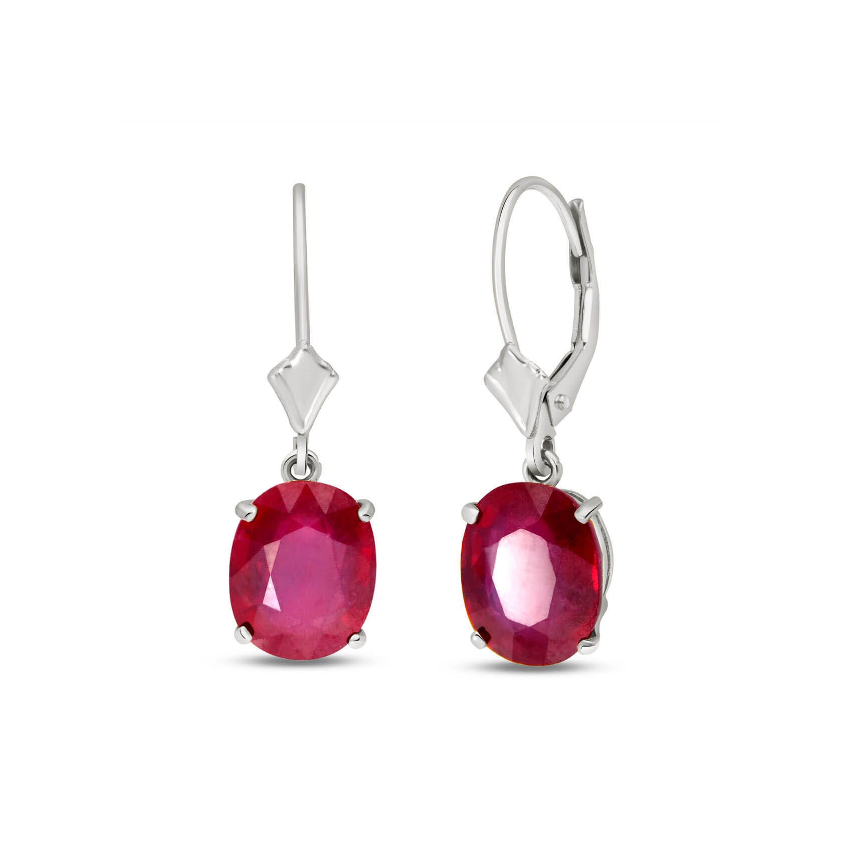 Ruby Leverback Earrings handcrafted in solid white gold. Two genuine rubies, total 7 ct for both earrings combined. Oval cut. Size: 7.9 x 25.9 mm (0.31 x 1.02 in). Material: 9ct White Gold. Total metal weight: 2.5 gr. 2 oval cut rubies (10 x 8 mm, VS1 clarity) = 7 ct total for pair. Colour: Red. Stone cut: Oval Cut. Anniversary: 15th Anniversary, 40th Anniversary. Birthstone: July.