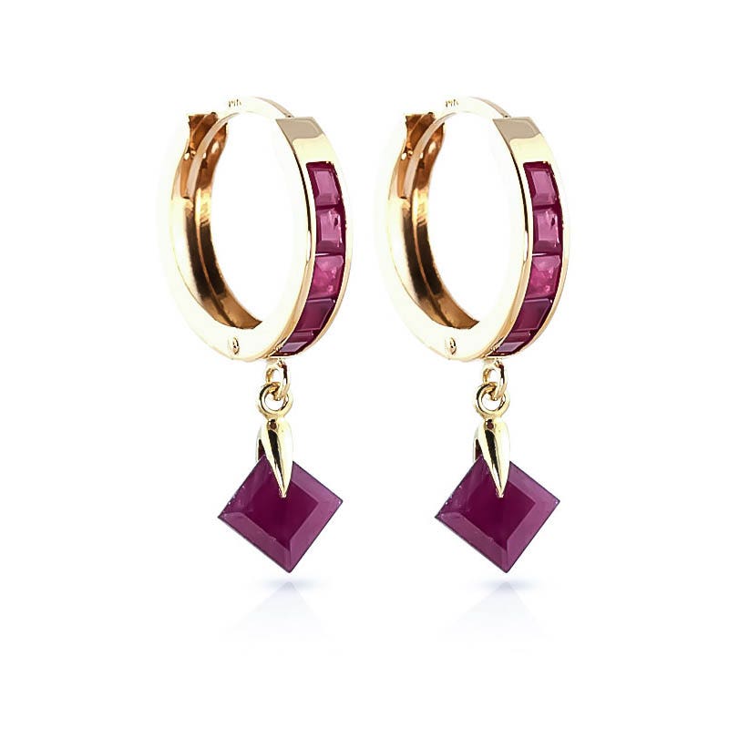Ruby Hoop Earrings handcrafted in solid gold. Twelve gemstones, total 3.7 ct for both earrings combined. Princess cut. Size: 3 x 26.7 mm (0.12 x 1.05 in). Material: 9ct Gold. Total metal weight: 2.0 gr. 10 princess cut rubies (2.5 x 2.5 mm, VS1 clarity) = 1.3 ct total for pair. 2 square cut rubies (5 x 5 mm, VS1 clarity) = 2.4 ct total for pair. Colour: Red. Stone cut: Princess Cut. Anniversary: 15th Anniversary, 40th Anniversary. Birthstone: July.