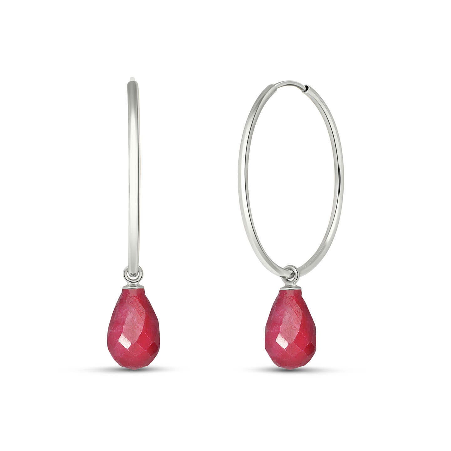 Ruby Hoop Earrings handcrafted in solid white gold. Two genuine rubies, total 6.6 ct for both earrings combined. Briolette cut. Size: 6.1 x 34.3 mm (0.24 x 1.35 in). Material: 9ct White Gold. Total metal weight: 2.4 gr. 2 briolette cut rubies (9 x 6 mm, VS1 clarity) = 6.6 ct total for pair. Colour: Red. Stone cut: Briolette Cut. Anniversary: 15th Anniversary, 40th Anniversary. Birthstone: July.