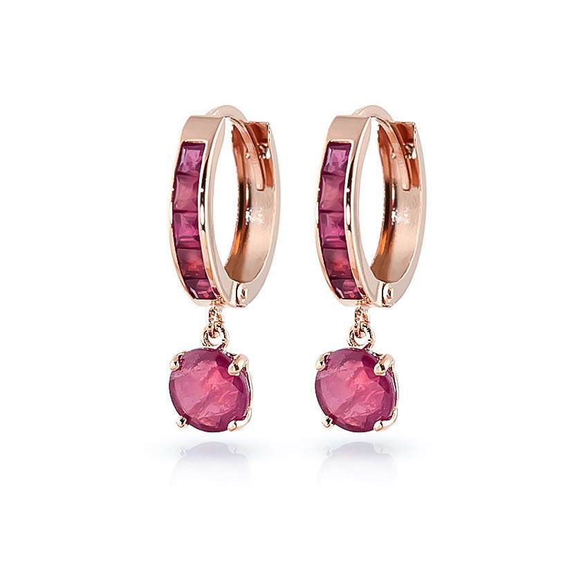 Ruby Hoop Huggie Earrings handcrafted in rose gold plated 9ct gold. Twelve gemstones, total 3.3 ct for both earrings combined. Princess cut. Size: 6.1 x 23.1 mm (0.24 x 0.91 in). Material: 9ct Rose Gold. Total metal weight: 2.0 gr. 10 princess cut rubies (2.5 x 2.5 mm, VS1 clarity) = 1.3 ct total for pair. 2 round cut rubies (6 x 6 mm, VS1 clarity) = 2 ct total for pair. Colour: Red. Stone cut: Princess Cut. Anniversary: 15th Anniversary, 40th Anniversary. Birthstone: July.