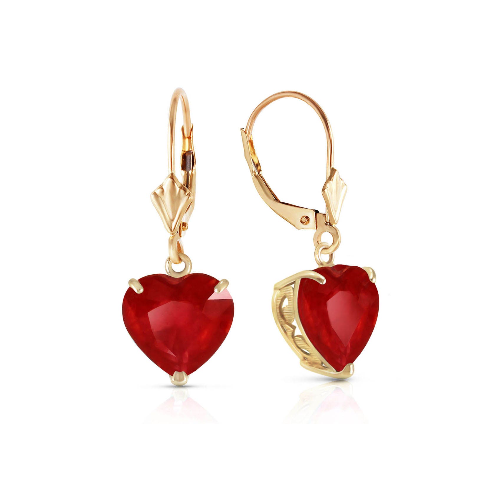 Ruby Leverback Earrings handcrafted in solid gold. Two genuine rubies, total 8.6 ct for both earrings combined. Heart shaped. Size: 10.2 x 28.7 mm (0.4 x 1.13 in). Material: 9ct Gold. Total metal weight: 2.8 gr. 2 heart shaped rubies (10 x 10 mm, VS1 clarity) = 8.6 ct total for pair. Colour: Red. Stone cut: Heart Shaped. Anniversary: 15th Anniversary, 40th Anniversary. Birthstone: July.