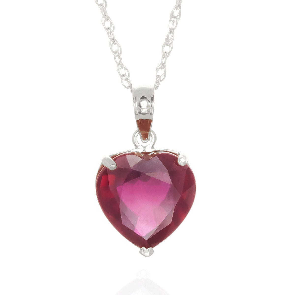 Ruby Pendant Necklace handcrafted in solid white gold. Single 4.3 ct genuine ruby. Heart shaped. The pendant is suspended from a white gold double link rope chain with spring clasp. Size: 10.2 x 17.8 mm (0.4 x 0.7 in). Material: 9ct White Gold. Total metal weight: 2.74 gr. 1 heart shaped ruby (10 x 10 mm, VS1 clarity) = 4.3 ct. Colour: Red. Stone cut: Heart Shaped. Anniversary: 15th Anniversary, 40th Anniversary. Birthstone: July.