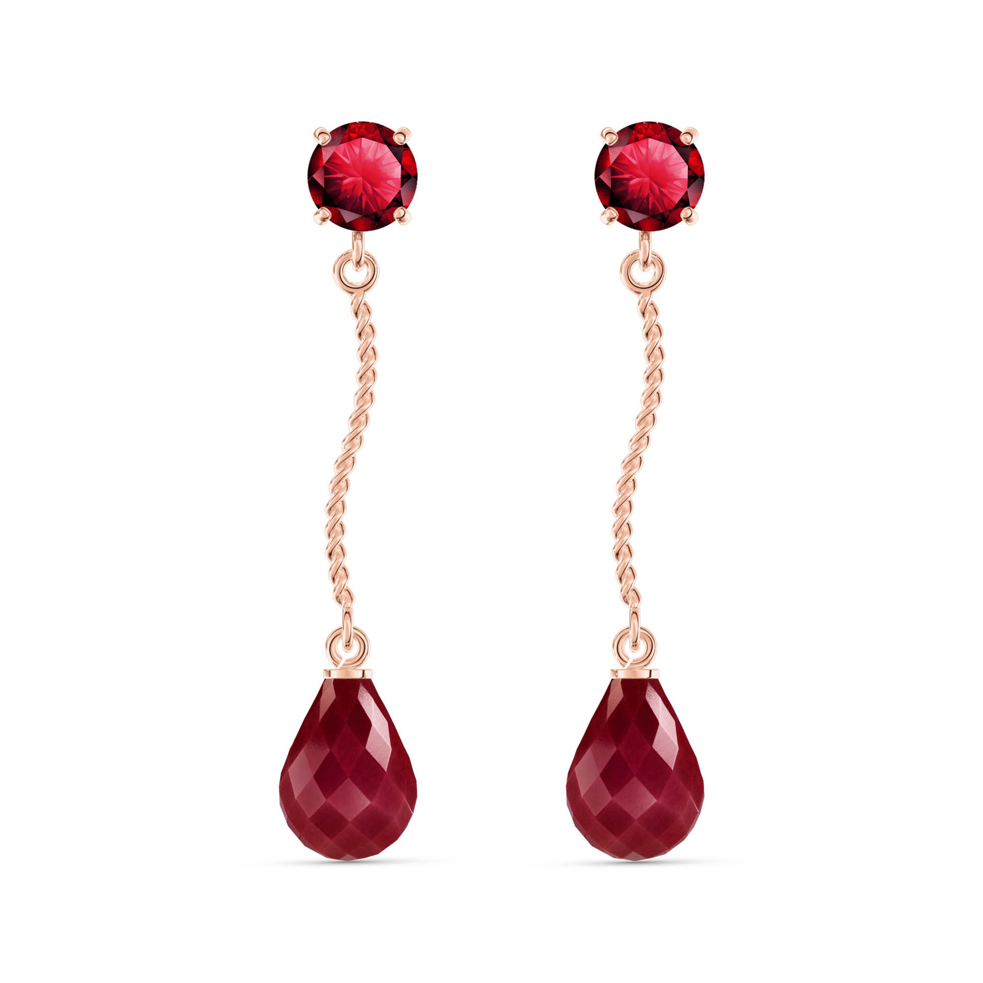 Ruby Chandelierdrop Earrings handcrafted in rose gold plated 9ct gold. Four gemstones, total 7.9 ct for both earrings combined. Round cut. Size: 6.1 x 37.6 mm (0.24 x 1.48 in). Material: 9ct Rose Gold. Total metal weight: 2.2 gr. 2 round cut rubies (5 x 5 mm, VS1 clarity) = 1.3 ct total for pair. 2 briolette cut rubies (9 x 6 mm, VS1 clarity) = 6.6 ct total for pair. Colour: Red. Stone cut: Round Cut. Anniversary: 15th Anniversary, 40th Anniversary. Birthstone: July.
