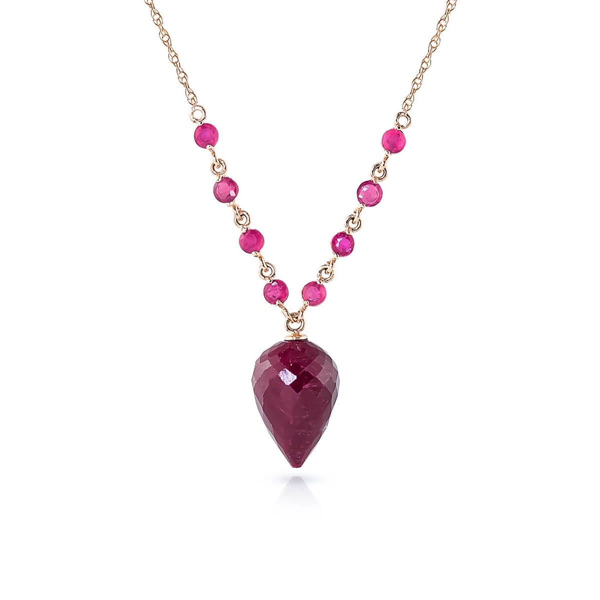 Ruby Drop Pendant Necklace handcrafted in rose gold plated 9ct gold. Nine gemstones, total 14 ct. Pointed briolette cut. The pendant is suspended from a rose gold double link rope chain with spring clasp. Size: 21.6 mm (0.85 in). Material: 9ct Rose Gold. Total metal weight: 3.74 gr. 1 pointed briolette cut ruby (15 x 10 mm, VS1 clarity) = 13 ct. 8 round cut rubies (3 x 3 mm, VS1 clarity) = 1 ct total. Colour: Red. Stone cut: Pointed Briolette Cut. Anniversary: 15th Anniversary, 40th Anniversary. Birthstone: July.
