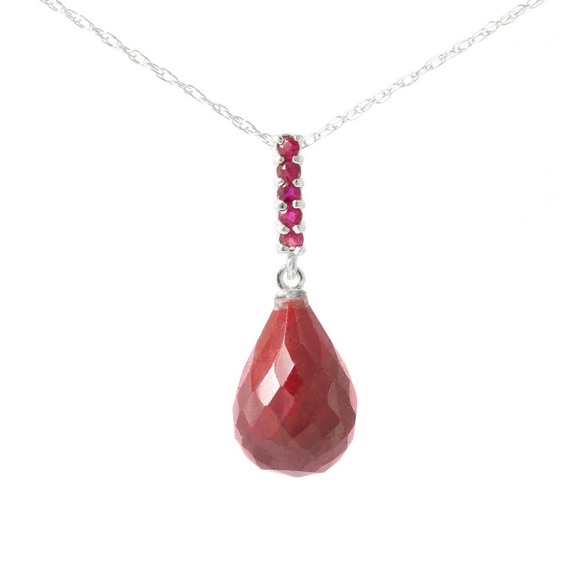Ruby Drop Pendant Necklace handcrafted in solid white gold. Six gemstones, total 9 ct. Briolette cut. The pendant is suspended from a white gold double link rope chain with spring clasp. Size: 7.9 x 24.4 mm (0.31 x 0.96 in). Material: 9ct White Gold. Total metal weight: 3.54 gr. 1 briolette cut ruby (12 x 8 mm, VS1 clarity) = 8.8 ct. 5 round cut rubies (1.5 x 1.5 mm, VS1 clarity) = 0.2 ct total. Colour: Red. Stone cut: Briolette Cut. Anniversary: 15th Anniversary, 40th Anniversary. Birthstone: July.