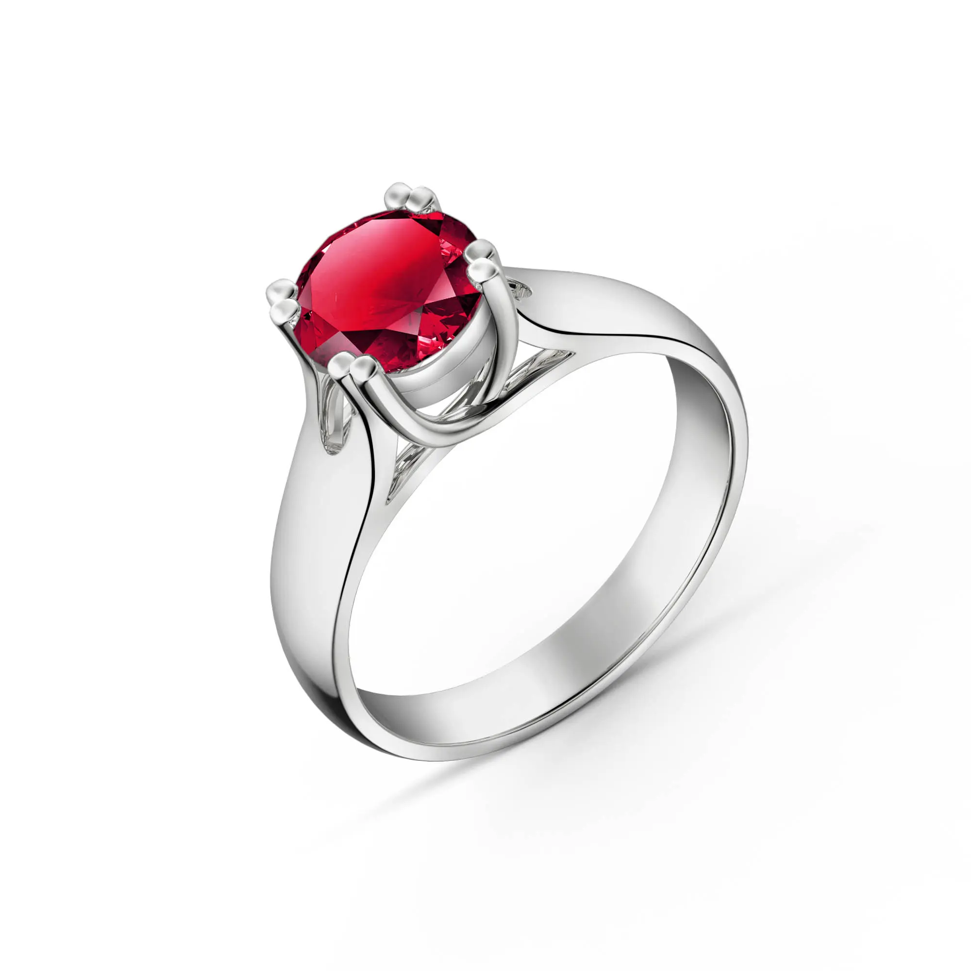 Ruby Ring handcrafted in solid sterling silver. Single 1.35 ct genuine ruby. Round cut. Available from sizes H to Z including half sizes. Size: 6.4 mm (0.25 in). Material: Sterling Silver. Total metal weight: 3.1 gr. 1 round cut ruby (6 x 6 mm, VS1 clarity) = 1.35 ct. Colour: Red. Stone cut: Round Cut. Anniversary: 15th Anniversary, 40th Anniversary. Birthstone: July.
