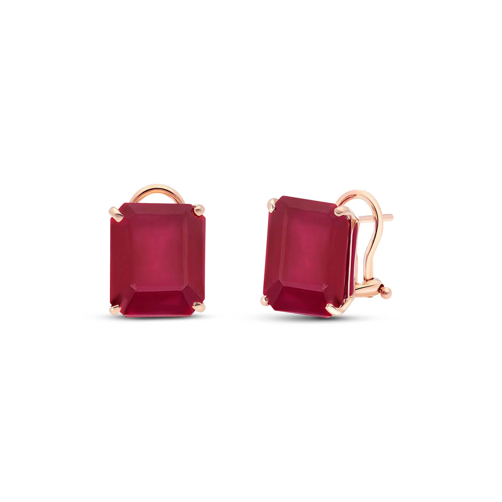 Ruby Stud Earrings handcrafted in rose gold plated 9ct gold. Two genuine rubies, total 15 ct for both earrings combined. Emerald cut. Post with friction back to fasten. Size: 9.9 x 11.9 mm (0.39 x 0.47 in). Material: 9ct Rose Gold. Total metal weight: 4.4 gr. 2 emerald cut rubies (12 x 10 mm, VS1 clarity) = 15 ct total for pair. Colour: Red. Stone cut: Emerald Cut. Anniversary: 15th Anniversary, 40th Anniversary. Birthstone: July.