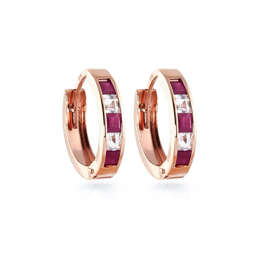 Ruby & White Topaz Hoop Earrings handcrafted in rose gold plated 9ct gold. Ten gemstones, total 1.26 ct for both earrings combined. Princess cut. Size: 3.3 x 14.5 mm (0.13 x 0.57 in). Material: 9ct Rose Gold. Total metal weight: 1.2 gr. 6 princess cut rubies (2.5 x 2.5 mm, VS1 clarity) = 0.78 ct total for pair. 4 princess cut white topaz (2.5 x 2.5 mm) = 0.48 ct total for pair. Colour: Red. Stone cut: Princess Cut. Anniversary: 15th Anniversary, 40th Anniversary. Birthstone: July.
