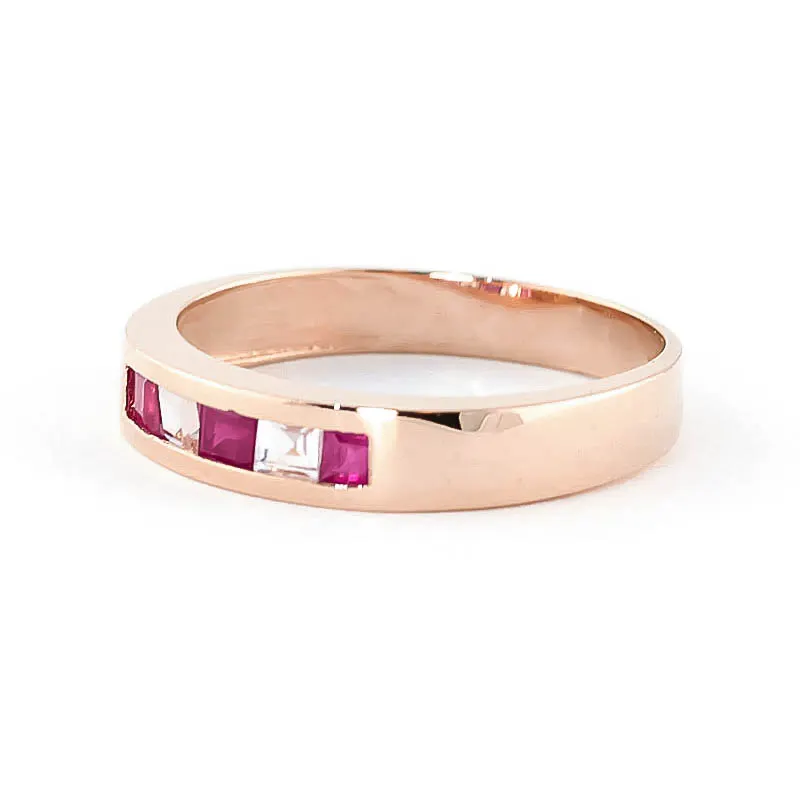 Ruby & White Topaz Ring handcrafted in solid 18ct rose gold. Eight gemstones, total 1.02 ct. Princess cut. Available from sizes H to Z including half sizes. Size: 3.8 mm (0.15 in). Material: 18ct Rose Gold. Total metal weight: 2.9 gr. 6 princess cut rubies (2.5 x 2.5 mm, VS1 clarity) = 0.78 ct total. 2 princess cut white topaz (2.5 x 2.5 mm) = 0.24 ct total. Colour: Red. Stone cut: Princess Cut. Anniversary: 15th Anniversary, 40th Anniversary. Birthstone: July.