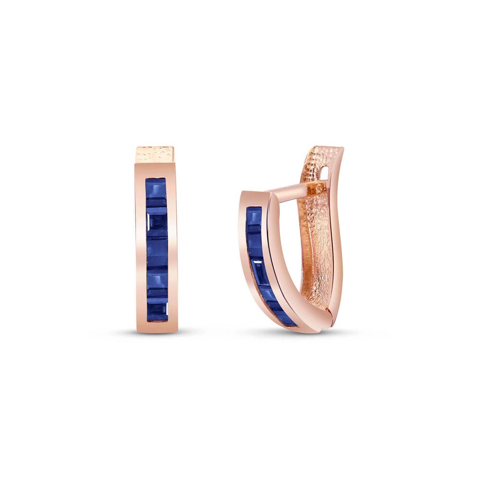 Sapphire Hoop Huggie Earrings handcrafted in rose gold plated 9ct gold. Ten genuine sapphires, total 1.3 ct for both earrings combined. Princess cut. Size: 3.6 x 16 mm (0.14 x 0.63 in). Material: 9ct Rose Gold. Total metal weight: 1.2 gr. 10 princess cut sapphires (2.5 x 2.5 mm) = 1.3 ct total for pair. Colour: Blue. Stone cut: Princess Cut. Anniversary: 5th Anniversary, 45th Anniversary. Birthstone: September.