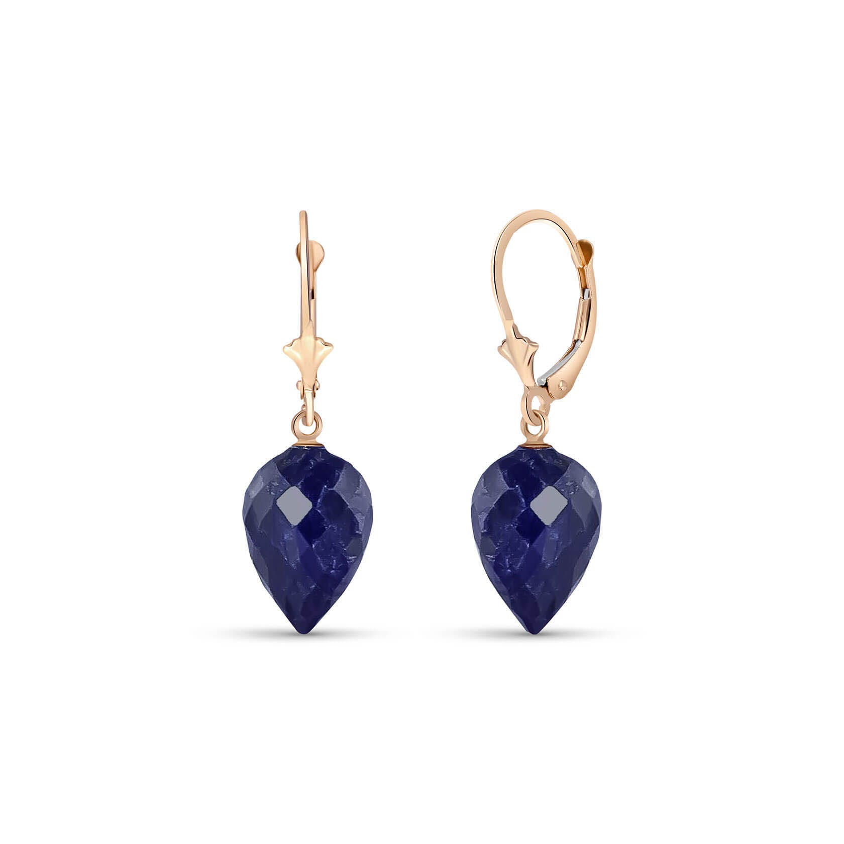 Sapphire Chandelierdrop Drop Earrings handcrafted in rose gold plated 9ct gold. Two genuine sapphires, total 25.7 ct for both earrings combined. Pointed briolette cut. Size: 10.2 x 33.3 mm (0.4 x 1.31 in). Material: 9ct Rose Gold. Total metal weight: 5.3 gr. 2 pointed briolette cut sapphires (15 x 10 mm) = 25.7 ct total for pair. Colour: Blue. Stone cut: Pointed Briolette Cut. Anniversary: 5th Anniversary, 45th Anniversary. Birthstone: September.