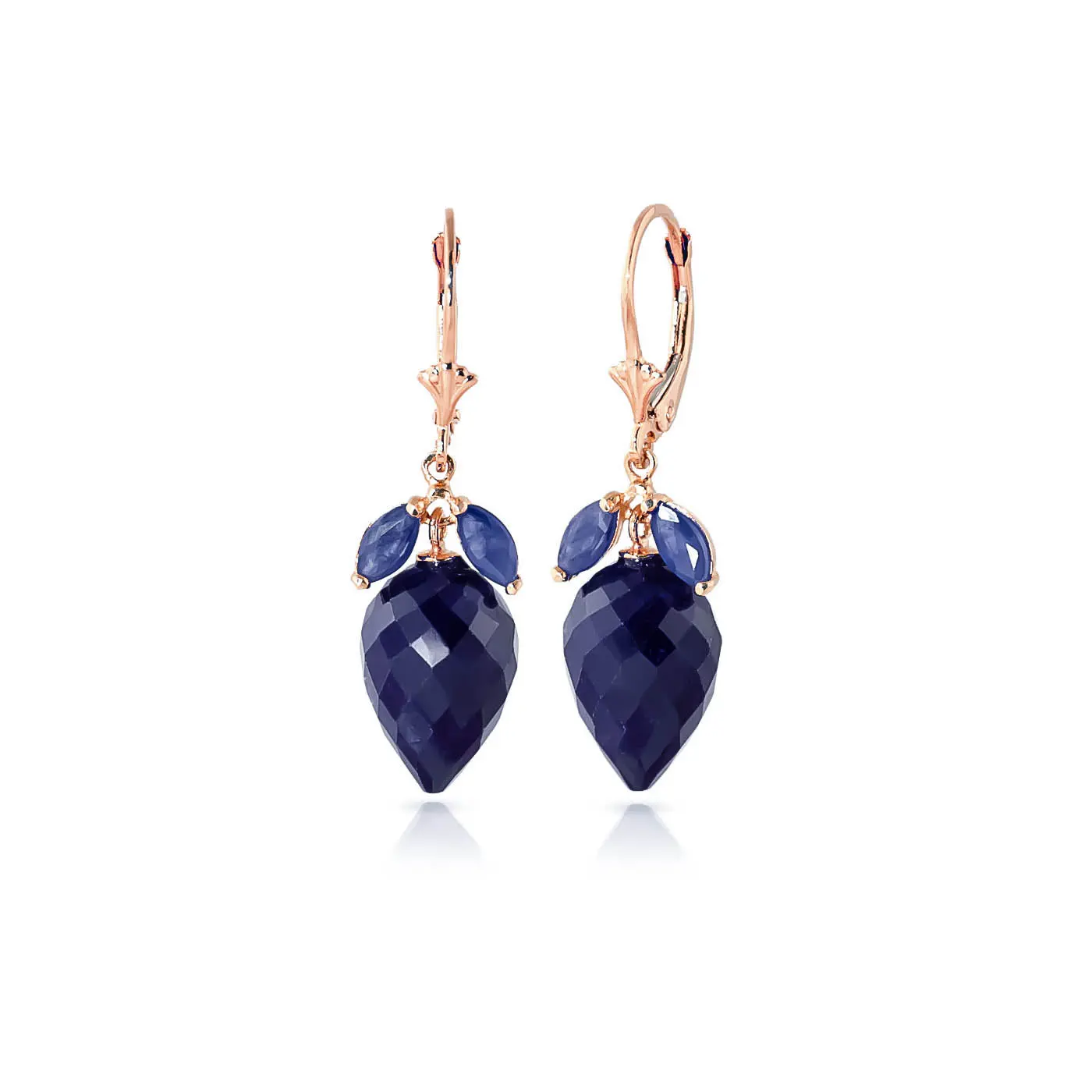 Sapphire Chandelierdrop Earrings handcrafted in rose gold plated 9ct gold. Six gemstones, total 26.8 ct for both earrings combined. Pointed briolette cut. Size: 11.2 x 36.8 mm (0.44 x 1.45 in). Material: 9ct Rose Gold. Total metal weight: 6.0 gr. 2 pointed briolette cut sapphires (15 x 10 mm) = 25.8 ct total for pair. 4 marquise cut sapphires (6 x 3 mm) = 1 ct total for pair. Colour: Blue. Stone cut: Pointed Briolette Cut. Anniversary: 5th Anniversary, 45th Anniversary. Birthstone: September.