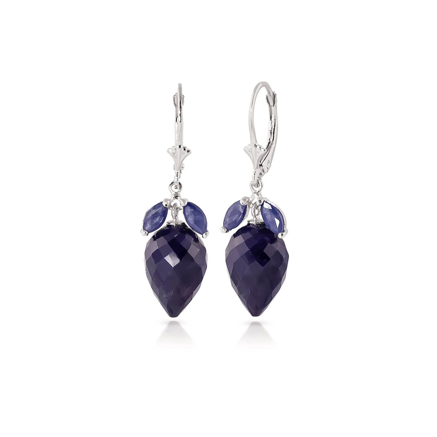 Sapphire Chandelier Earrings handcrafted in solid white gold. Six gemstones, total 26.8 ct for both earrings combined. Pointed briolette cut. Size: 11.2 x 36.8 mm (0.44 x 1.45 in). Material: 9ct White Gold. Total metal weight: 6.0 gr. 2 pointed briolette cut sapphires (15 x 10 mm) = 25.8 ct total for pair. 4 marquise cut sapphires (6 x 3 mm) = 1 ct total for pair. Colour: Blue. Stone cut: Pointed Briolette Cut. Anniversary: 5th Anniversary, 45th Anniversary. Birthstone: September.