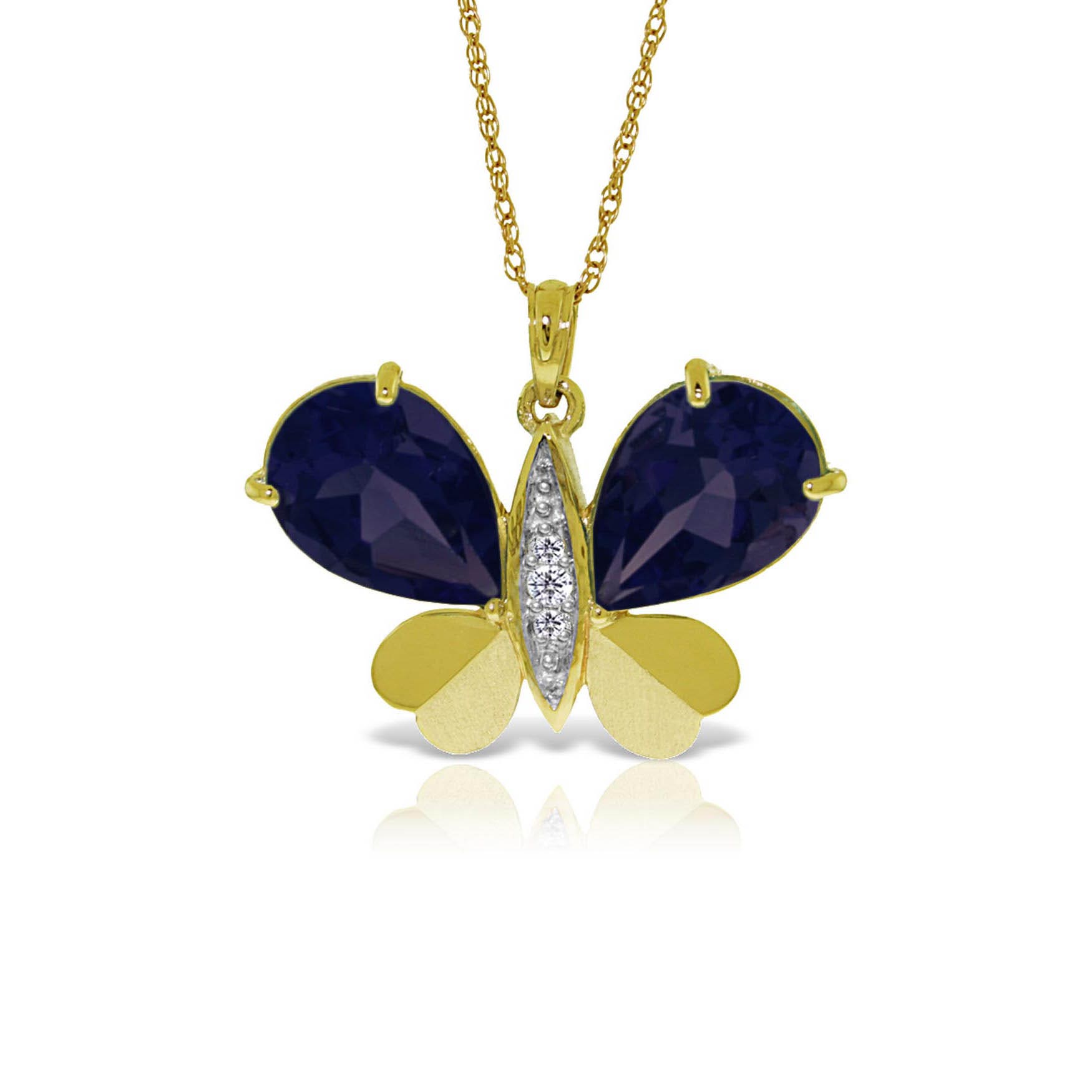 Sapphire & Diamond Butterfly Pendant Necklace handcrafted in solid gold. Two genuine sapphires, total 10.5 ct, three diamonds, total 0.1 ct. Pear cut. The pendant hangs from a gold double link rope chain with spring clasp. Size: 27.4 x 22.9 mm (1.08 x 0.9 in). Material: 9ct Gold. Total metal weight: 5.94 gr. 2 pear cut sapphires (13 x 9 mm) = 10.5 ct total. 3 round cut diamonds (K colour, I3 clarity) = 0.1 ct total. Colour: Blue. Stone cut: Pear Cut. Anniversary: 5th Anniversary, 45th Anniversary. Birthstone: September.