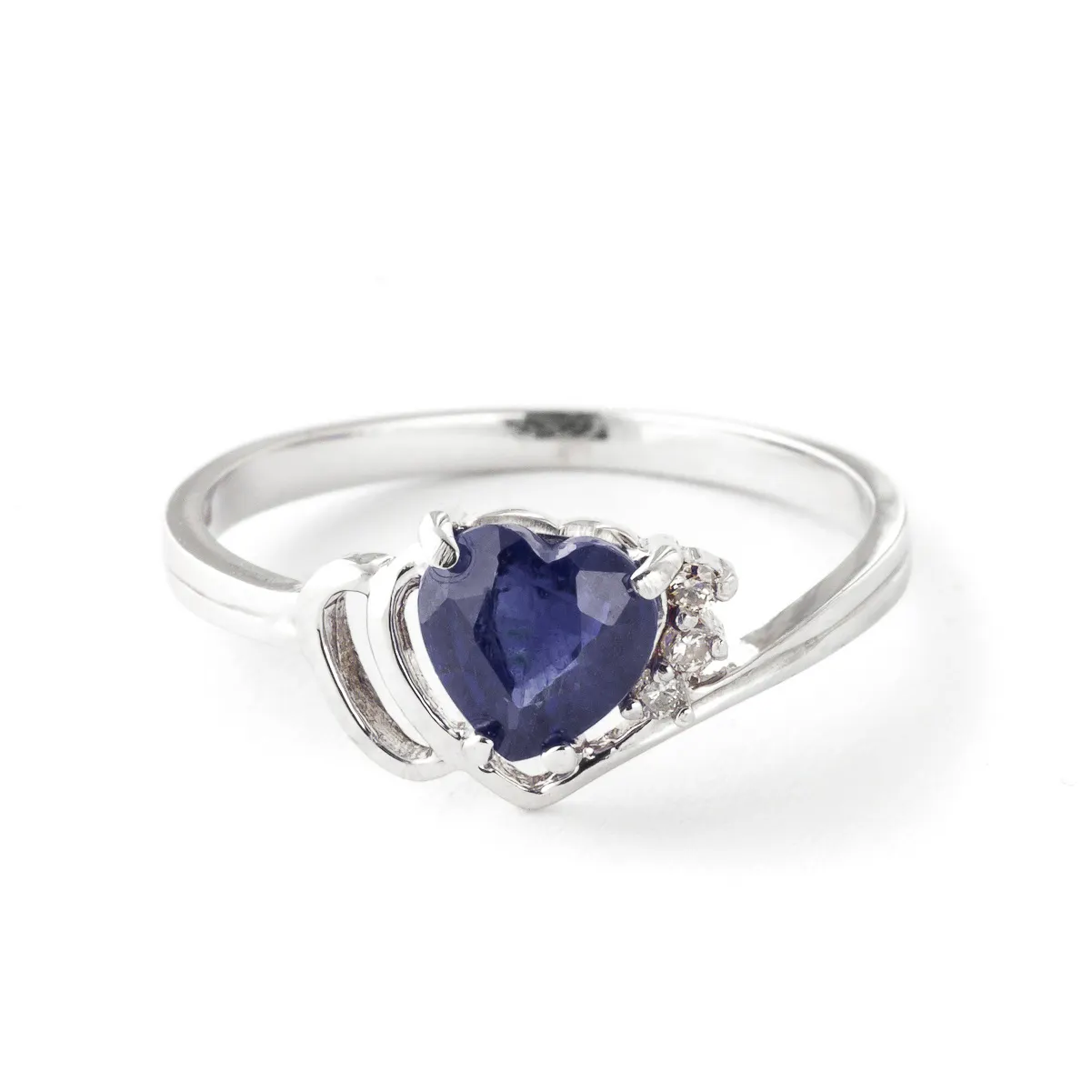 Sapphire & Diamond Ring handcrafted in solid 18ct white gold. Single 1 ct genuine sapphire, three diamonds, total 0.02 ct. Heart shaped. Available from sizes H to Z including half sizes. Size: 8.1 mm (0.32 in). Material: 18ct White Gold. Total metal weight: 1.9 gr. 1 heart shaped sapphire (6 x 6 mm) = 1 ct. 3 round cut diamonds (K colour, SI2 clarity) = 0.02 ct total. Colour: Blue. Stone cut: Heart Shaped. Anniversary: 5th Anniversary, 45th Anniversary. Birthstone: September.