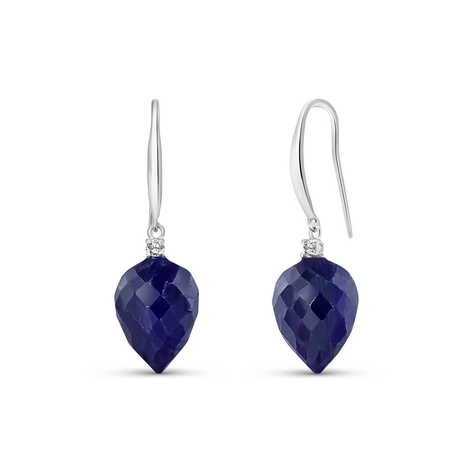Sapphire & Diamond Fish Hook Earrings handcrafted in solid white gold. Two genuine sapphires, total 25.8 ct, two diamonds, total 0.1 ct for both earrings combined. Pointed briolette cut. Size: 10.2 x 34.8 mm (0.4 x 1.37 in). Material: 9ct White Gold. Total metal weight: 5.1 gr. 2 pointed briolette cut sapphires (15 x 10 mm) = 25.8 ct total for pair. 2 round cut diamonds (K colour, I3 clarity) = 0.1 ct total for pair. Colour: Blue. Stone cut: Pointed Briolette Cut. Anniversary: 5th Anniversary, 45th Anniversary. Birthstone: September.