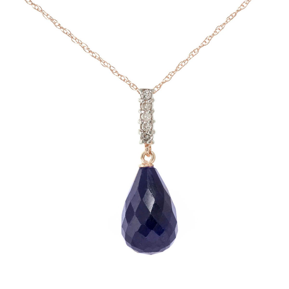 Sapphire & Diamond Drop Pendant Necklace handcrafted in rose gold plated 9ct gold. Single 8.8 ct genuine sapphire, five diamonds, total 0.08 ct. Briolette cut. The pendant is suspended from a rose gold double link rope chain with spring clasp. Size: 7.9 x 24.4 mm (0.31 x 0.96 in). Material: 9ct Rose Gold. Total metal weight: 3.54 gr. 1 briolette cut sapphire = 8.8 ct. 5 round cut diamonds (K colour, I3 clarity) = 0.08 ct total. Colour: Blue. Stone cut: Briolette Cut. Anniversary: 5th Anniversary, 45th Anniversary. Birthstone: September.