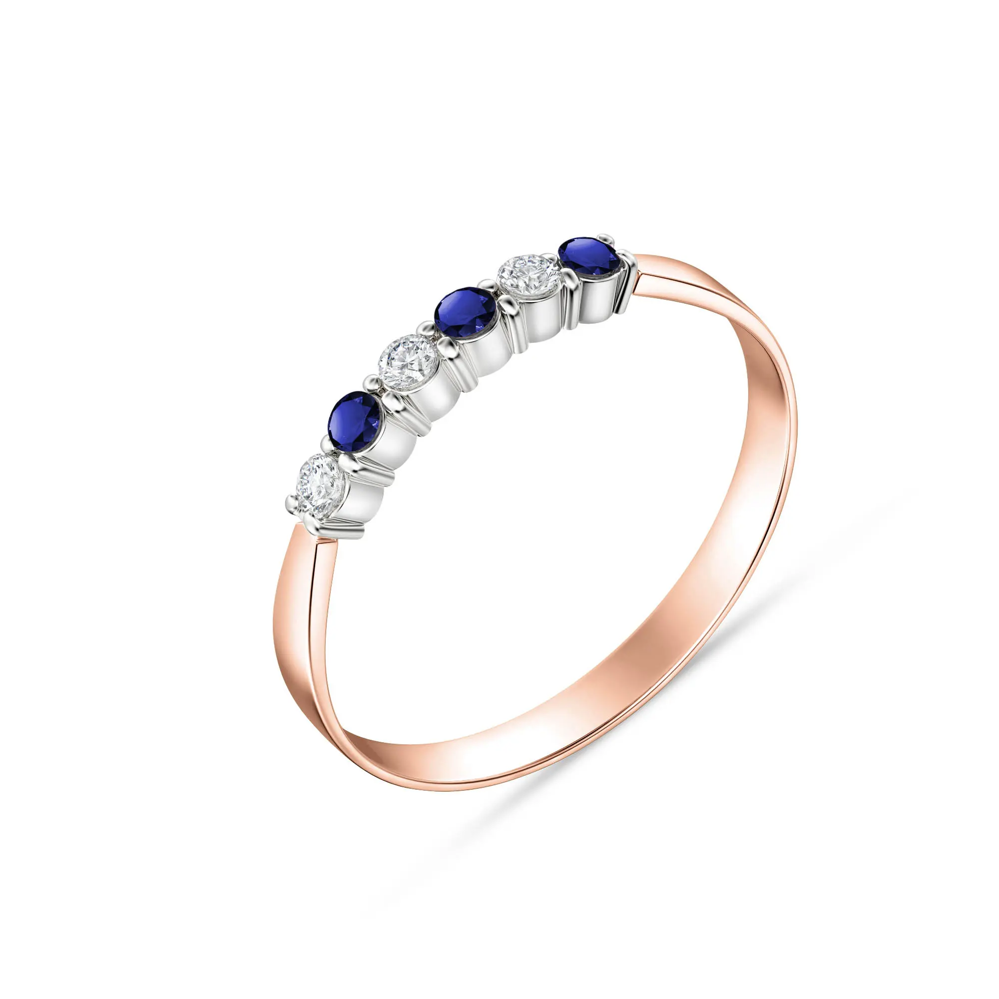Sapphire & Diamond Ring handcrafted in solid 18ct rose gold. Three genuine sapphires, total 0.06 ct, three diamonds, total 0.05 ct. Round cut. Available from sizes H to Z including half sizes. Size: 2 mm (0.08 in). Material: 18ct Rose Gold. Total metal weight: 1.3 gr. 3 round cut sapphires (0.015 x 0.015 mm) = 0.06 ct total. 3 round cut diamonds (I colour, SI1 clarity) = 0.05 ct total. Colour: Blue. Stone cut: Round Cut. Anniversary: 5th Anniversary, 45th Anniversary. Birthstone: September.