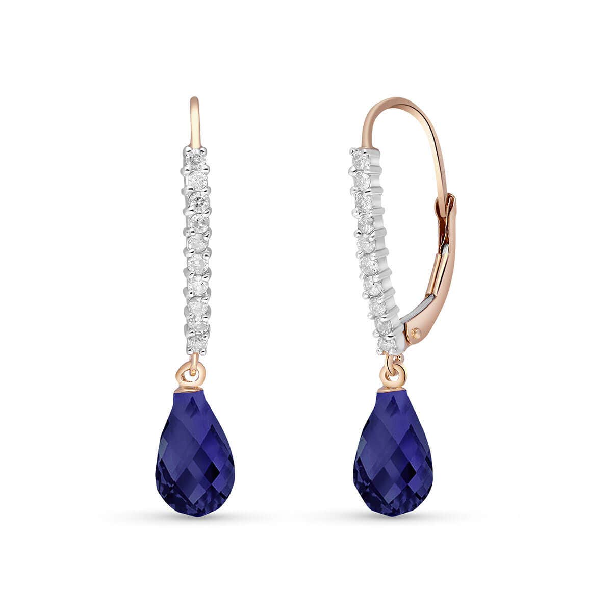 Sapphire & Diamond Leverback Earrings handcrafted in rose gold plated 9ct gold. Two genuine sapphires, total 6.6 ct, 20 diamonds, total 0.3 ct for both earrings combined. Briolette cut. Size: 2.3 x 31 mm (0.09 x 1.22 in). Material: 9ct Rose Gold. Total metal weight: 2.4 gr. 2 briolette cut sapphires (9 x 6 mm) = 6.6 ct total for pair. 20 round cut diamonds (I colour, SI1 clarity) = 0.3 ct total for pair. Colour: Blue. Stone cut: Briolette Cut. Anniversary: 5th Anniversary, 45th Anniversary. Birthstone: September.