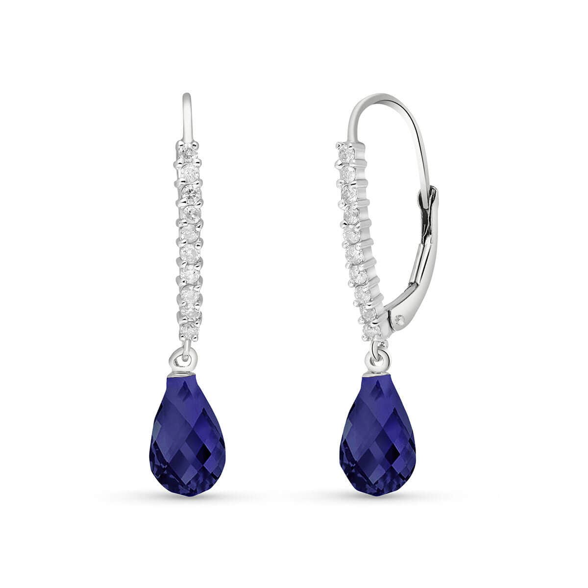 Sapphire & Diamond Leverback Earrings handcrafted in solid white gold. Two genuine sapphires, total 6.6 ct, 20 diamonds, total 0.3 ct for both earrings combined. Briolette cut. Size: 2.3 x 31 mm (0.09 x 1.22 in). Material: 9ct White Gold. Total metal weight: 2.4 gr. 2 briolette cut sapphires (9 x 6 mm) = 6.6 ct total for pair. 20 round cut diamonds (I colour, SI1 clarity) = 0.3 ct total for pair. Colour: Blue. Stone cut: Briolette Cut. Anniversary: 5th Anniversary, 45th Anniversary. Birthstone: September.