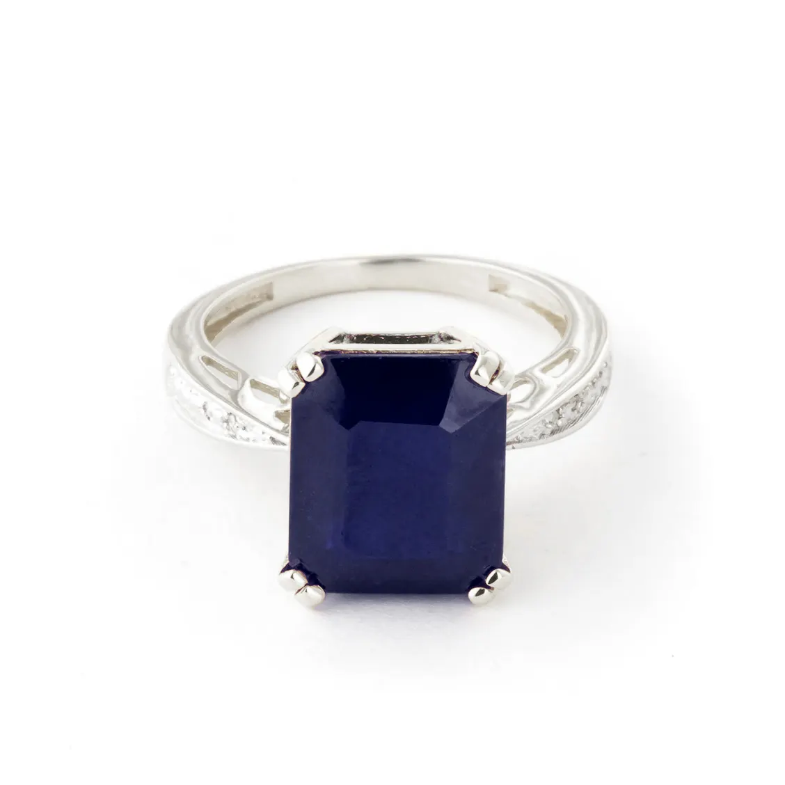 Sapphire & Diamond Ring handcrafted in solid sterling silver. Single 7.25 ct genuine sapphire, four diamonds, total 0.02 ct. Emerald cut. Available from sizes H to Z including half sizes. Size: 12.7 mm (0.5 in). Material: Sterling Silver. Total metal weight: 3.1 gr. 1 emerald cut sapphire = 7.25 ct. 4 round cut diamonds (K colour, I3 clarity) = 0.02 ct total. Colour: Blue. Stone cut: Emerald Cut. Anniversary: 5th Anniversary, 45th Anniversary. Birthstone: September.