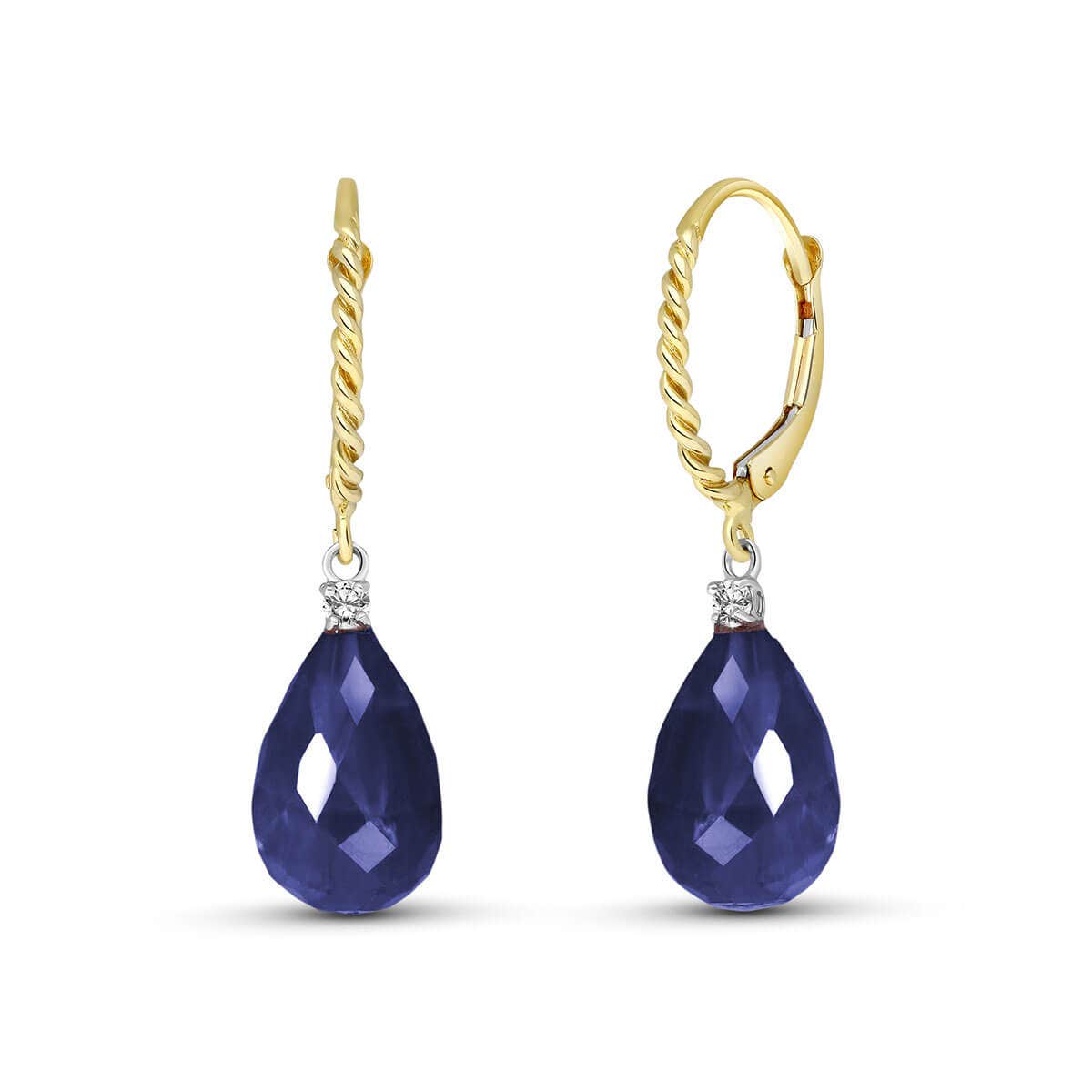 Sapphire & Diamond Leverback Earrings handcrafted in solid gold. Two genuine sapphires, total 17.6 ct, two diamonds, total 0.1 ct for both earrings combined. Briolette cut. Size: 8.4 x 32.8 mm (0.33 x 1.29 in). Material: 9ct Gold. Total metal weight: 3.9 gr. 2 briolette cut sapphires (12 x 8 mm) = 17.6 ct total for pair. 2 round cut diamonds (K colour, SI2 clarity) = 0.1 ct total for pair. Colour: Blue. Stone cut: Briolette Cut. Anniversary: 5th Anniversary, 45th Anniversary. Birthstone: September.