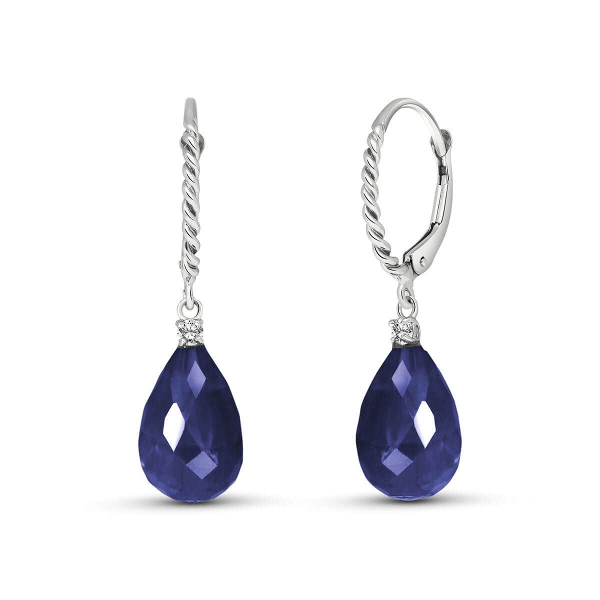 Sapphire & Diamond Leverback Earrings handcrafted in solid white gold. Two genuine sapphires, total 17.6 ct, two diamonds, total 0.1 ct for both earrings combined. Briolette cut. Size: 8.4 x 32.8 mm (0.33 x 1.29 in). Material: 9ct White Gold. Total metal weight: 3.9 gr. 2 briolette cut sapphires (12 x 8 mm) = 17.6 ct total for pair. 2 round cut diamonds (K colour, SI2 clarity) = 0.1 ct total for pair. Colour: Blue. Stone cut: Briolette Cut. Anniversary: 5th Anniversary, 45th Anniversary. Birthstone: September.