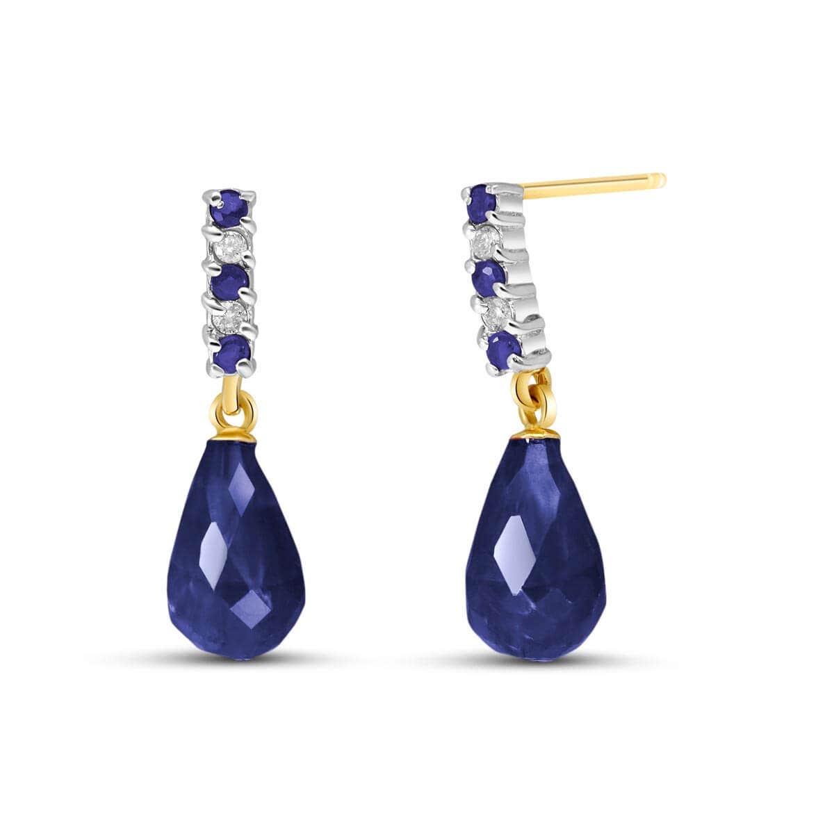 Sapphire & Diamond Stud Earrings handcrafted in solid gold. Eight gemstones, total 6.84 ct, four diamonds, total 0.06 ct for both earrings combined. Briolette cut. Post with friction back to fasten. Size: 5.1 x 21.6 mm (0.2 x 0.85 in). Material: 9ct Gold. Total metal weight: 1.1 gr. 2 briolette cut sapphires = 6.6 ct total for pair. 6 round cut sapphires = 0.24 ct total for pair. 4 round cut diamonds (K colour, SI2 clarity) = 0.06 ct total for pair. Colour: Blue. Stone cut: Briolette Cut. Anniversary: 5th Anniversary, 45th Anniversary. Birthstone: September.