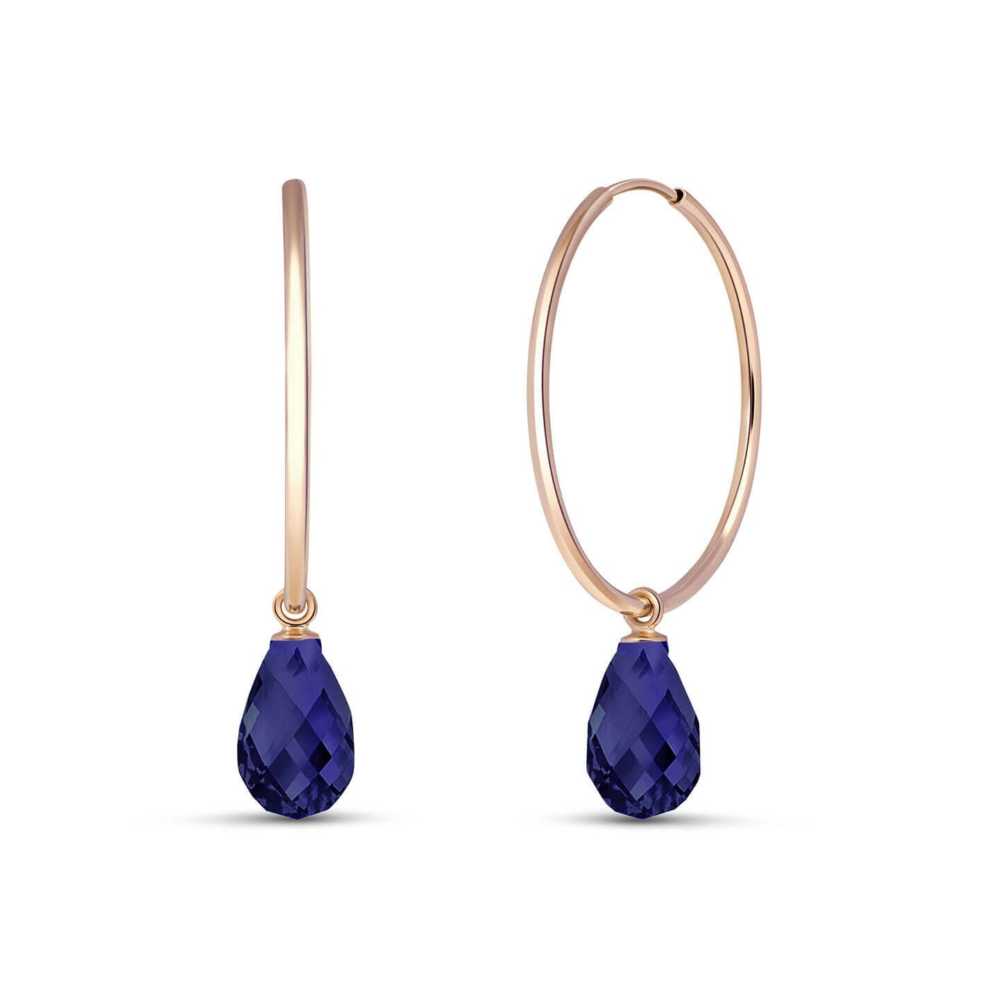 Sapphire Hoop Earrings handcrafted in rose gold plated 9ct gold. Two genuine sapphires, total 6.6 ct for both earrings combined. Briolette cut. Size: 6.1 x 34.3 mm (0.24 x 1.35 in). Material: 9ct Rose Gold. Total metal weight: 2.4 gr. 2 briolette cut sapphires (9 x 6 mm) = 6.6 ct total for pair. Colour: Blue. Stone cut: Briolette Cut. Anniversary: 5th Anniversary, 45th Anniversary. Birthstone: September.
