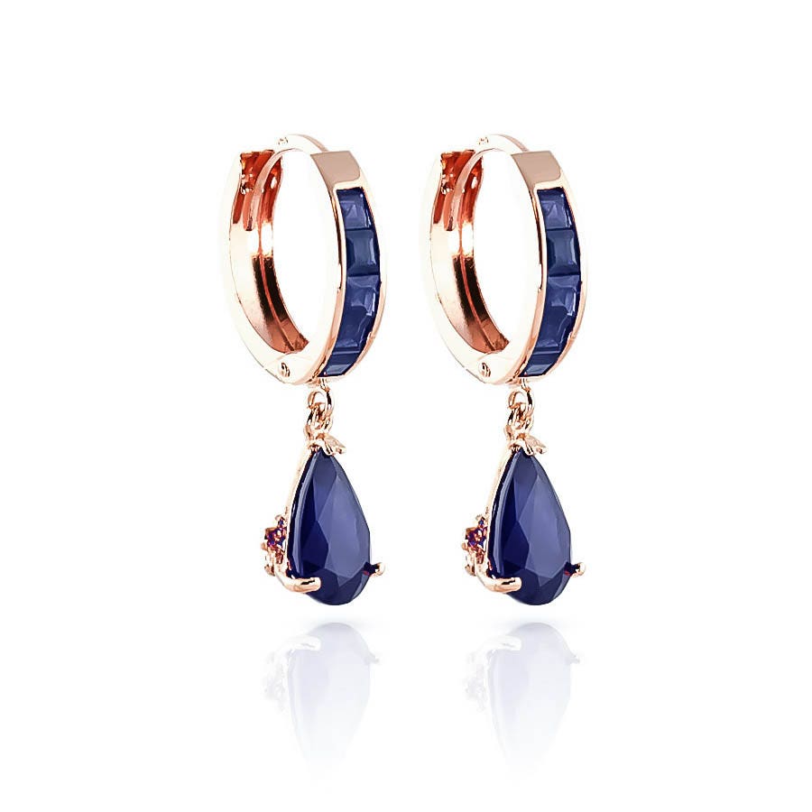 Sapphire Hoop Huggie Earrings handcrafted in rose gold plated 9ct gold. Twelve gemstones, total 4.55 ct for both earrings combined. Princess cut. Size: 6.1 x 28.7 mm (0.24 x 1.13 in). Material: 9ct Rose Gold. Total metal weight: 2.1 gr. 10 princess cut sapphires (2.5 x 2.5 mm) = 1.3 ct total for pair. 2 pear cut sapphires (9 x 6 mm) = 3.25 ct total for pair. Colour: Blue. Stone cut: Princess Cut. Anniversary: 5th Anniversary, 45th Anniversary. Birthstone: September.