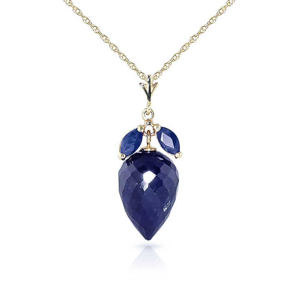 Sapphire Drop Pendant Necklace handcrafted in solid gold. Three gemstones, total 13.4 ct. Pointed briolette cut. The pendant is suspended from a gold double link rope chain with spring clasp. Size: 10.2 x 27.9 mm (0.4 x 1.1 in). Material: 9ct Gold. Total metal weight: 4.04 gr. 1 pointed briolette cut sapphire (15 x 10 mm) = 12.9 ct. 2 marquise cut sapphires (6 x 3 mm) = 0.5 ct total. Colour: Blue. Stone cut: Pointed Briolette Cut. Anniversary: 5th Anniversary, 45th Anniversary. Birthstone: September.