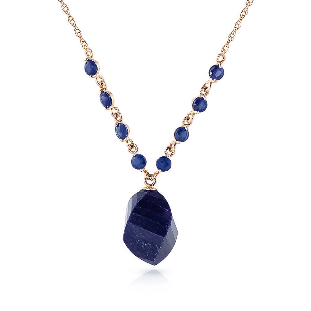 Sapphire Pendant Necklace handcrafted in rose gold plated 9ct gold. Nine gemstones, total 16.25 ct. Twisted briolette cut. The pendant hangs from a rose gold double link rope chain with spring clasp. Size: 21.6 mm (0.85 in). Material: 9ct Rose Gold. Total metal weight: 4.24 gr. 1 twisted briolette cut sapphire (15 x 13 mm) = 15.25 ct. 8 round cut sapphires (3 x 3 mm) = 1 ct total. Colour: Blue. Stone cut: Twisted Briolette Cut. Anniversary: 5th Anniversary, 45th Anniversary. Birthstone: September.