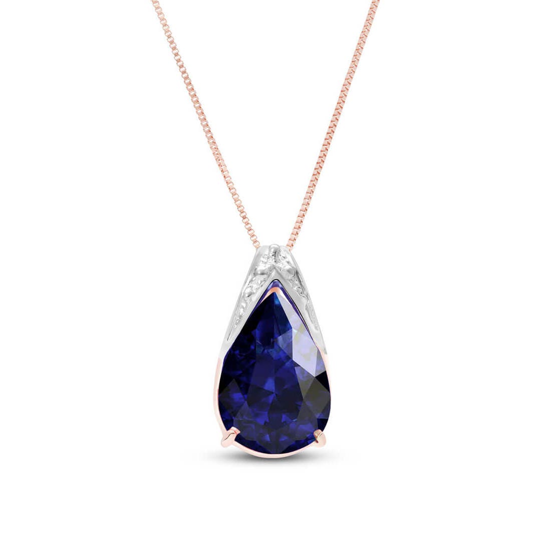 Sapphire Pendant Necklace handcrafted in rose gold plated 9ct gold. Single 4.65 ct genuine sapphire. Pear cut. The pendant hangs from a rose gold box chain with spring clasp. Size: 9.1 x 15.2 mm (0.36 x 0.6 in). Material: 9ct Rose Gold. Total metal weight: 2.7 gr. 1 pear cut sapphire (9 x 13 mm) = 4.65 ct. Colour: Blue. Stone cut: Pear Cut. Anniversary: 5th Anniversary, 45th Anniversary. Birthstone: September.