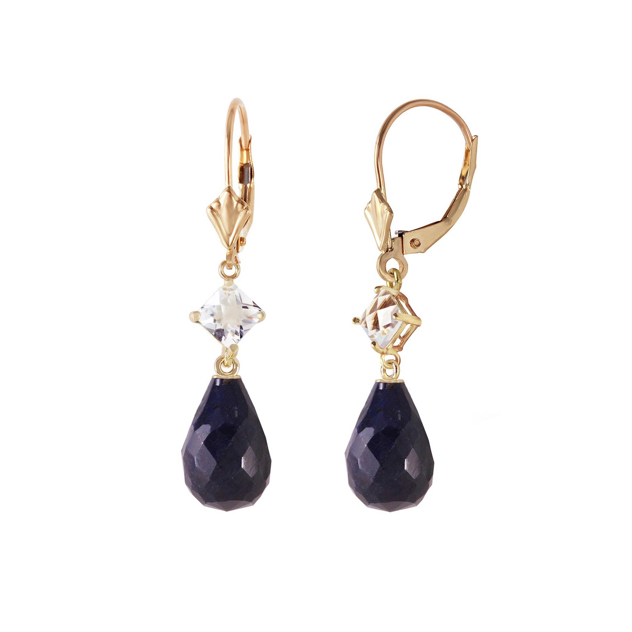 Sapphire & White Topaz Leverback Earrings handcrafted in solid gold. Four gemstones, total 18.6 ct for both earrings combined. Briolette cut. Size: 7.9 x 37.6 mm (0.31 x 1.48 in). Material: 9ct Gold. Total metal weight: 4.3 gr. 2 briolette cut sapphires (12 x 8 mm) = 17.6 ct total for pair. 2 square cut white topaz (4 x 4 mm) = 1 ct total for pair. Colour: Blue. Stone cut: Briolette Cut. Anniversary: 5th Anniversary, 45th Anniversary. Birthstone: September.