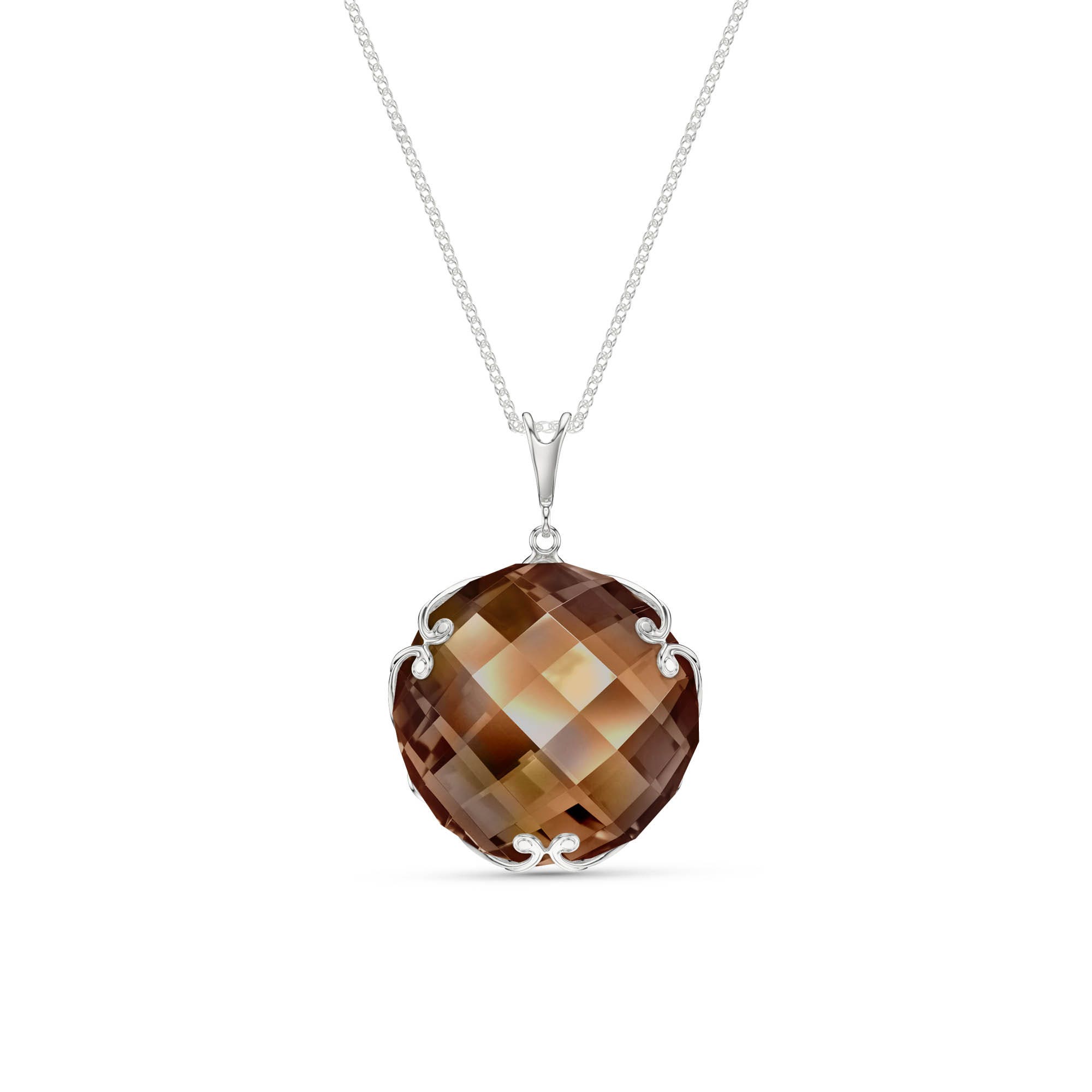 Smoky Quartz Pendant Necklace handcrafted in solid white gold. Single 17 ct genuine quartz. Round cut. The pendant is suspended from a white gold double link rope chain with spring clasp. Size: 20.1 x 28.2 mm (0.79 x 1.11 in). Material: 9ct White Gold. Total metal weight: 5.34 gr. 1 round cut smoky quartz (18 x 18 mm) = 17 ct. Colour: Brown. Stone cut: Round Cut.