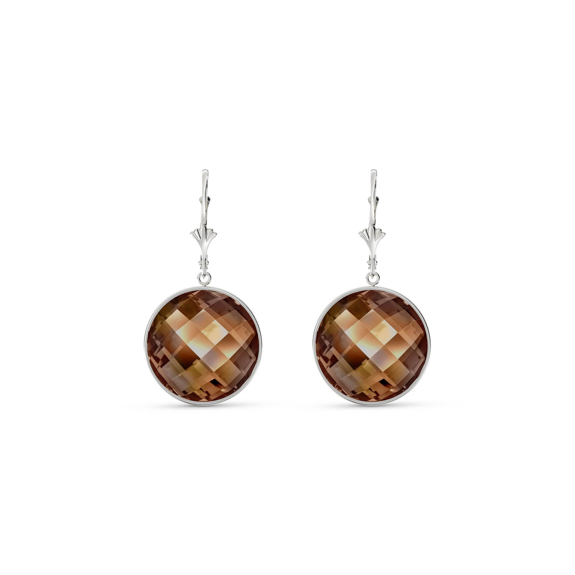 Smoky Quartz Leverback Earrings handcrafted in solid white gold. Two genuine quartz, total 34 ct for both earrings combined. Round cut. Size: 18.5 x 36.1 mm (0.73 x 1.42 in). Material: 9ct White Gold. Total metal weight: 3.6 gr. 2 round cut smoky quartz (18 x 18 mm) = 34 ct total for pair. Colour: Brown. Stone cut: Round Cut.