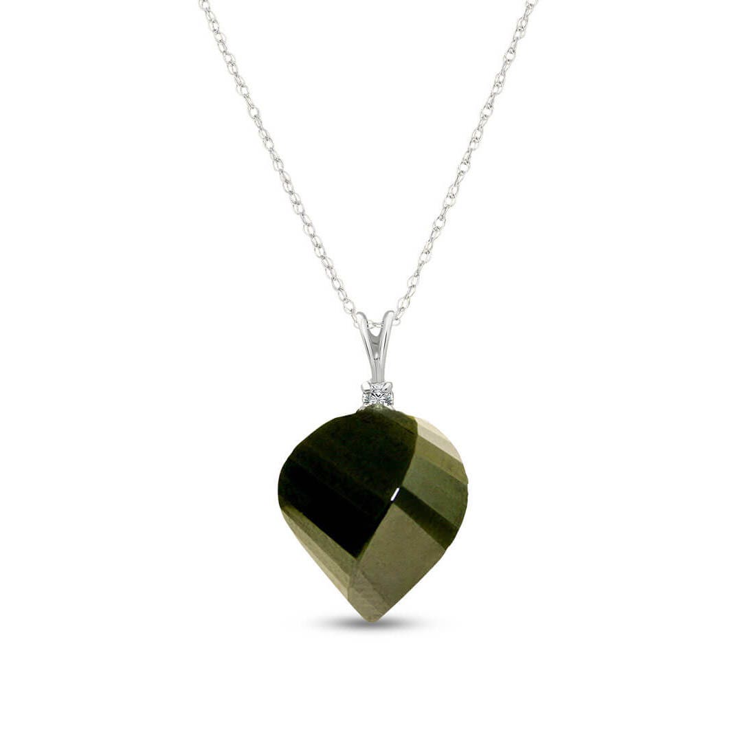 Spinel & Diamond Pendant Necklace handcrafted in solid white gold. Single 15.5 ct genuine spinel, single 0.05 ct diamond. Twisted briolette cut. The pendant is suspended from a white gold double link rope chain with spring clasp. Size: 12.7 x 22.6 mm (0.5 x 0.89 in). Material: 9ct White Gold. Total metal weight: 3.54 gr. 1 twisted briolette cut spinel (15 x 13 mm) = 15.5 ct. 1 round brilliant cut diamond (K colour, I3 clarity) = 0.05 ct. Colour: Black. Stone cut: Twisted Briolette Cut.