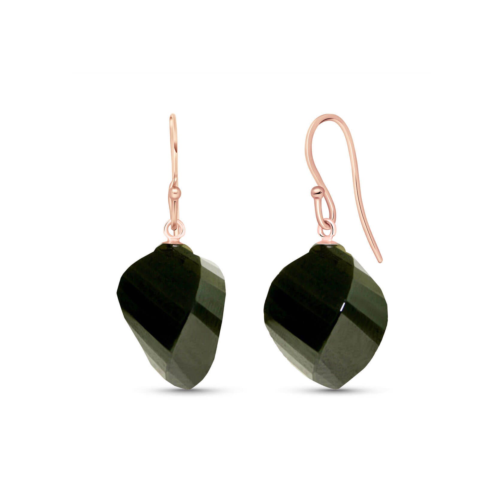 Spinel Fish Hook Earrings handcrafted in rose gold plated 9ct gold. Two genuine spinel, total 31 ct for both earrings combined. Twisted briolette cut. Size: 12.7 x 29.7 mm (0.5 x 1.17 in). Material: 9ct Rose Gold. Total metal weight: 5.8 gr. 2 twisted briolette cut spinel (15 x 13 mm) = 31 ct total for pair. Colour: Black. Stone cut: Twisted Briolette Cut.