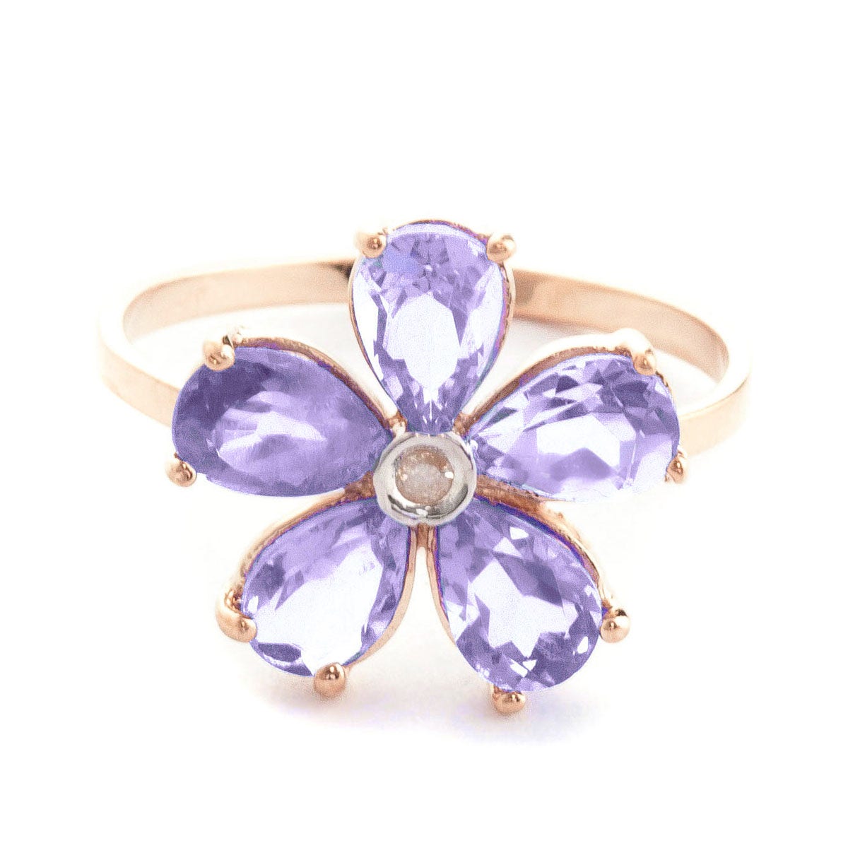 Tanzanite & Diamond Ring handcrafted in solid 18ct rose gold. Five genuine tanzanites, total 2.2 ct, single 0.02 ct diamond. Pear cut. Available from sizes H to Z including half sizes. Size: 14 mm (0.55 in). Material: 18ct Rose Gold. Total metal weight: 2.4 gr. 5 pear cut tanzanites (6 x 4 mm) = 2.2 ct total. 1 round brilliant cut diamond (K colour, SI2 clarity) = 0.02 ct. Colour: Blue. Stone cut: Pear Cut. Anniversary: 24th Anniversary. Birthstone: December.