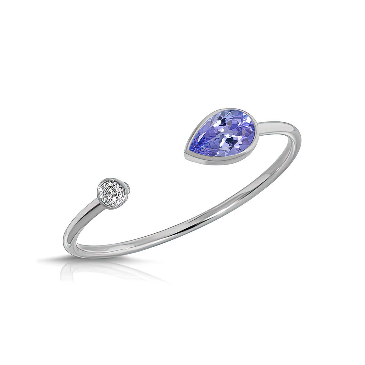 Tanzanite & Diamond Ring handcrafted in 9ct White Gold. Single 0.2 ct genuine tanzanite, single 0.03 ct diamond. Pear cut. Available from sizes H to Z including half sizes. Size: 1 x 18.8 mm (0.04 x 0.74 in). Material: 9ct White Gold. Total metal weight: 0.5 gr. 1 pear cut tanzanite (3 x 5 mm) = 0.2 ct. 1 round brilliant cut diamond (H colour, I3 clarity) = 0.03 ct. Colour: Purple. Stone cut: Pear cut. Anniversary: 24th Anniversary. Birthstone: December.