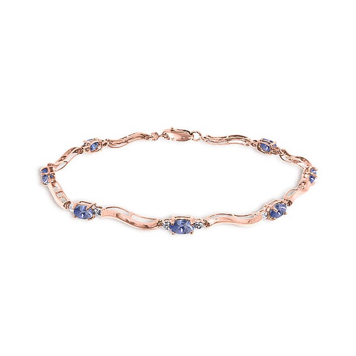 Tanzanite & Diamond Tennis Bracelet handcrafted in rose gold plated 9ct gold. Seven genuine tanzanites, total 2 ct, two diamonds, total 0.01 ct. Oval cut. Fastened by rose gold lobster clasp. Fits wrist up to 8.5″. Size: 4.3 mm (0.17 in). Material: 9ct Rose Gold. Total metal weight: 3.3 gr. 7 oval cut tanzanites (5 x 3 mm) = 2 ct total. 2 round cut diamonds (K colour, SI1 clarity) = 0.01 ct total. Colour: Blue. Stone cut: Oval Cut. Anniversary: 24th Anniversary. Birthstone: December.