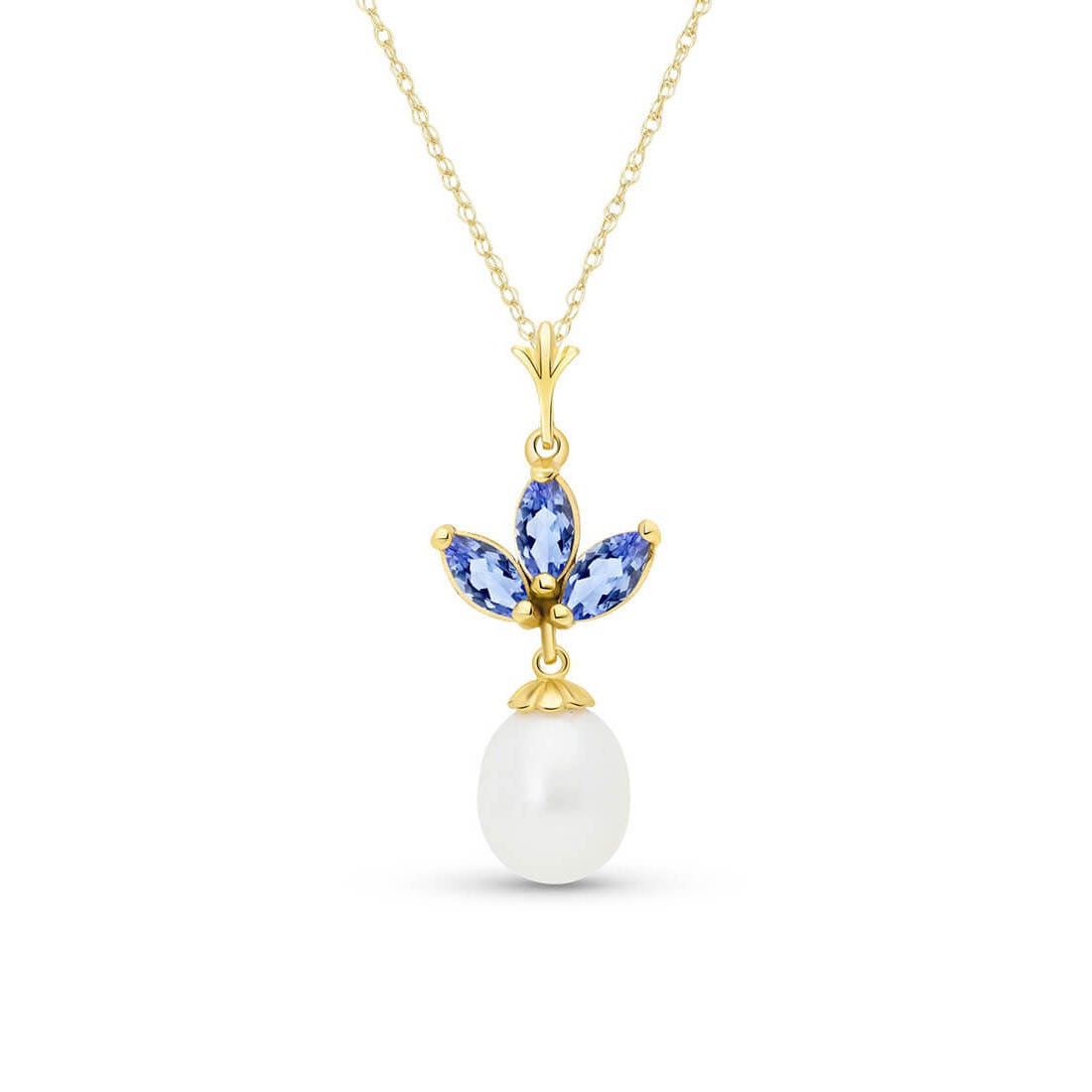 Tanzanite & Pearl Pendant Necklace handcrafted in solid gold. Four gemstones, total 4.75 ct. Marquise cut. The pendant is suspended from a gold double link rope chain with spring clasp. Size: 11.7 x 29.5 mm (0.46 x 1.16 in). Material: 9ct Gold. Total metal weight: 2.54 gr. 3 marquise cut tanzanites (6 x 3 mm) = 0.75 ct total. 1 freshwater pearl (10 x 8 mm) = 4 ct. Colour: Blue. Stone cut: Marquise Cut. Anniversary: 24th Anniversary. Birthstone: December.