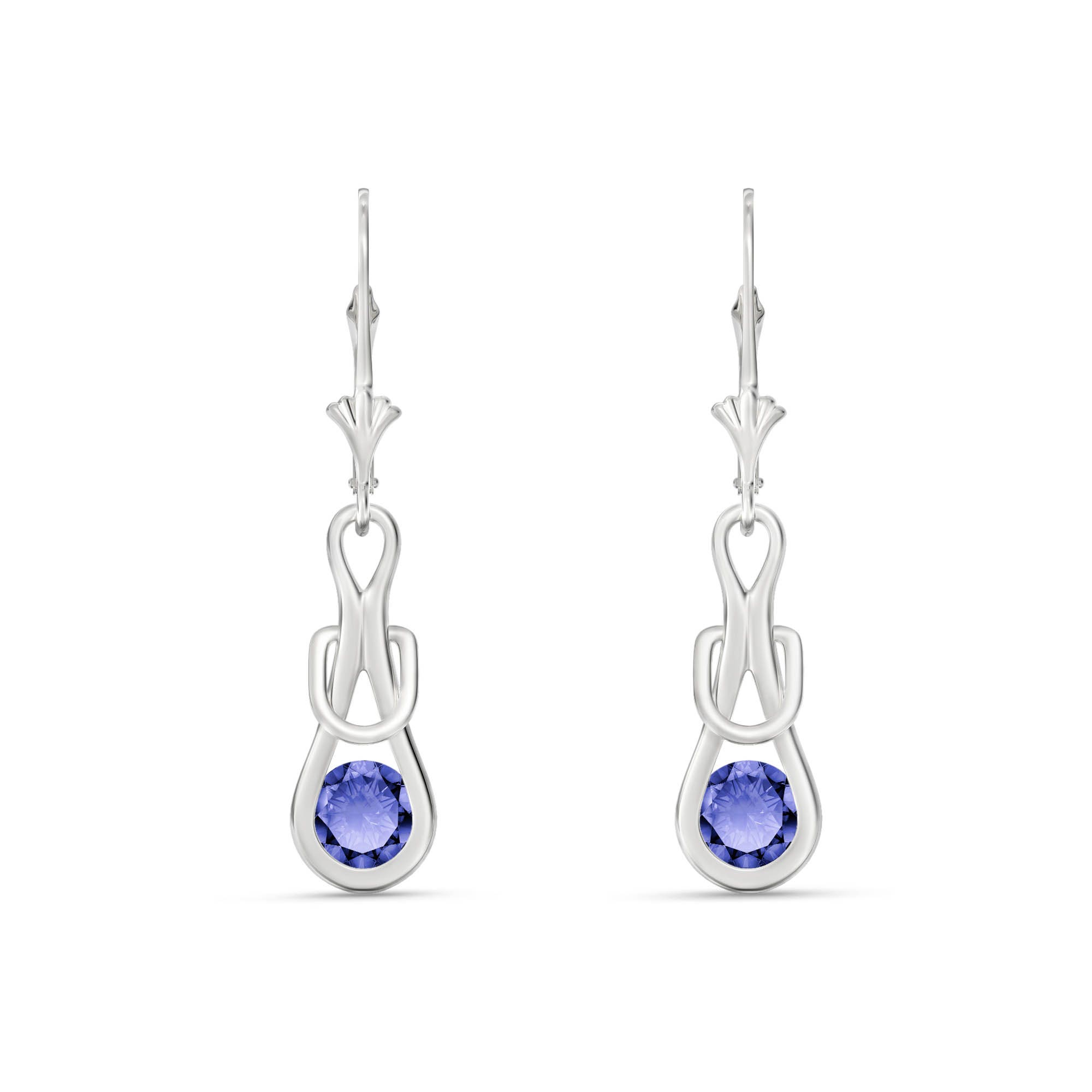 Tanzanite Leverback Earrings handcrafted in solid white gold. Two genuine tanzanites, total 1.3 ct for both earrings combined. Round cut. Size: 7.4 x 33.5 mm (0.29 x 1.32 in). Material: 9ct White Gold. Total metal weight: 2.3 gr. 2 round cut tanzanites (5 x 5 mm) = 1.3 ct total for pair. Colour: Blue. Stone cut: Round Cut. Anniversary: 24th Anniversary. Birthstone: December.