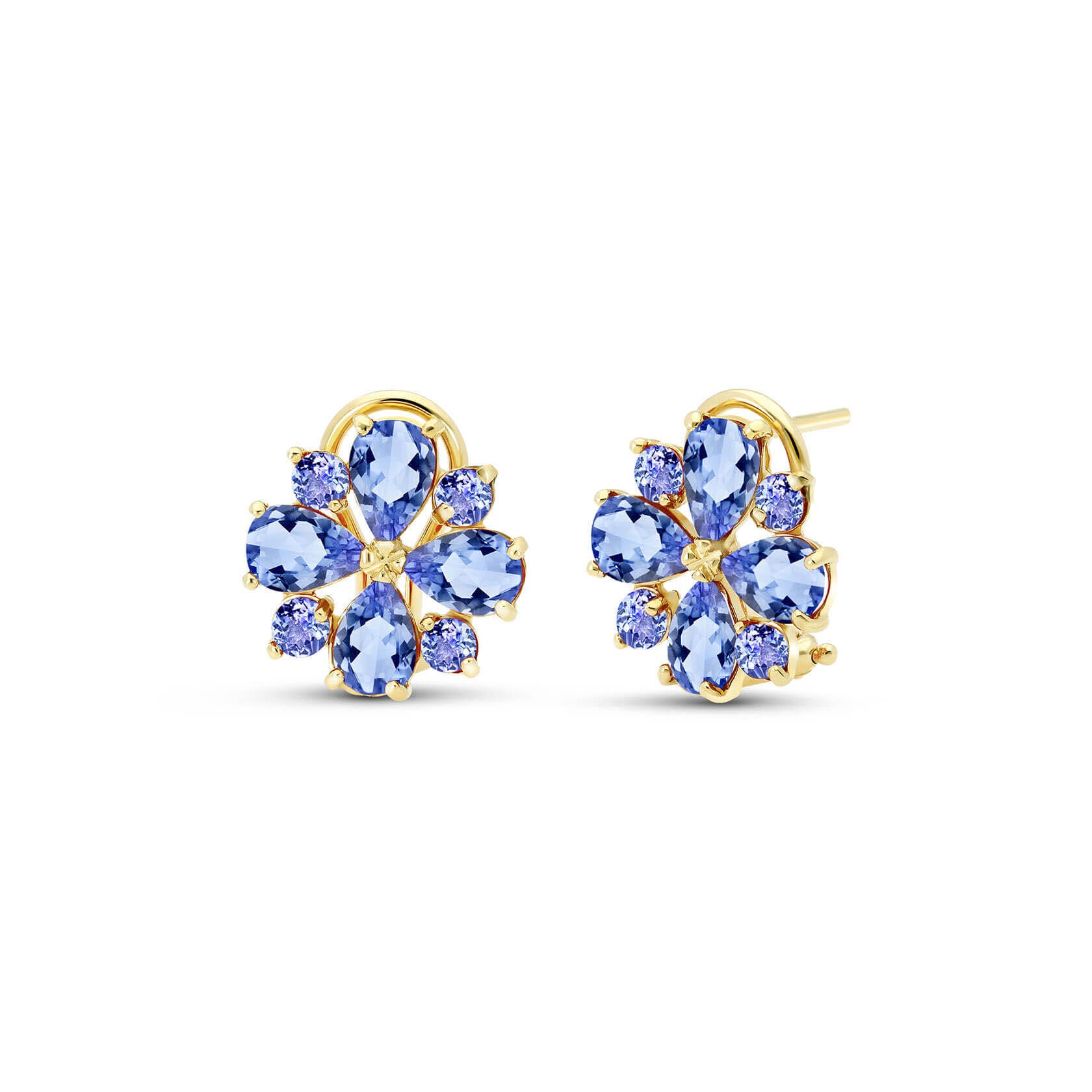 Tanzanite Stud Earrings handcrafted in solid gold. 16 gemstones, total 4.85 ct for both earrings combined. Pear cut. Post with friction back to fasten. Size: 14 x 14 mm (0.55 x 0.55 in). Material: 9ct Gold. Total metal weight: 3.1 gr. 8 pear cut tanzanites (6 x 4 mm) = 3.25 ct total for pair. 8 round cut tanzanites (3 x 3 mm) = 1.6 ct total for pair. Colour: Blue. Stone cut: Pear Cut. Anniversary: 24th Anniversary. Birthstone: December.