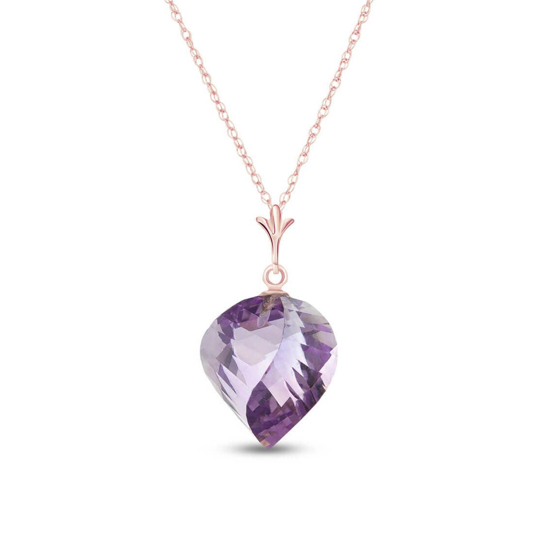 Amethyst Pendant Necklace handcrafted in rose gold plated 9ct gold. Single 10.75 ct genuine amethyst. Twisted briolette cut. The pendant is suspended from a rose gold double link rope chain with spring clasp. Size: 12.7 x 23.4 mm (0.5 x 0.92 in). Material: 9ct Rose Gold. Total metal weight: 2.94 gr. 1 twisted briolette cut amethyst (15 x 13 mm) = 10.75 ct. Colour: Purple. Stone cut: Twisted Briolette Cut. Anniversary: 6th Anniversary. Birthstone: February.