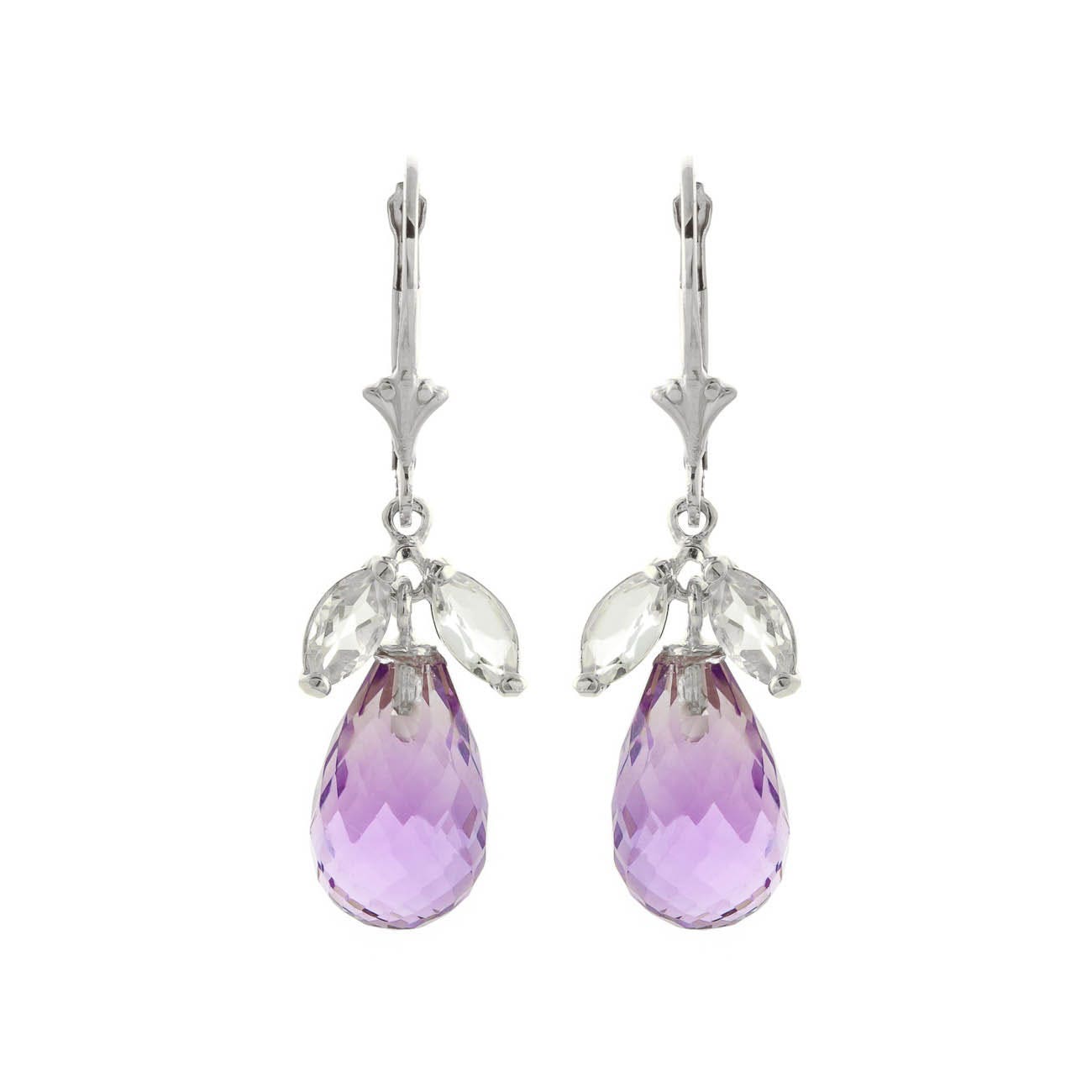 White Topaz & Amethyst Leverback Earrings handcrafted in solid white gold. Six gemstones, total 14.4 ct for both earrings combined. Marquise cut. Size: 10.2 x 33 mm (0.4 x 1.3 in). Material: 9ct White Gold. Total metal weight: 3.9 gr. 4 marquise cut white topaz (6 x 3 mm) = 1 ct total for pair. 2 briolette cut amethysts (12 x 8 mm) = 13.4 ct total for pair. Colour: White. Stone cut: Marquise Cut. Anniversary: 4th Anniversary. Birthstone: November.